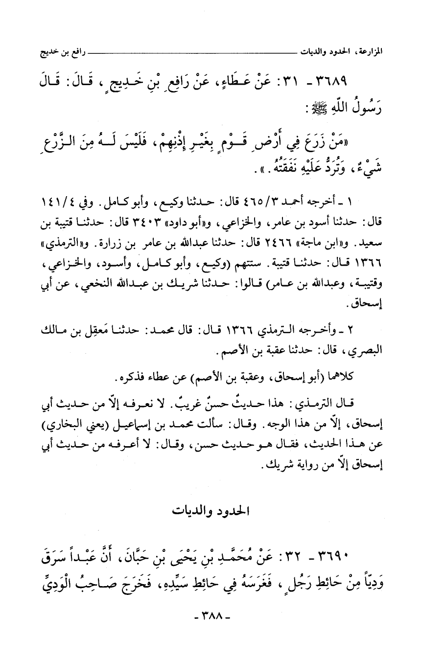 وسألتُ مُحَمد بن إِسْمَاعِيل (يَعْنِي البُخَارِي) عن هذا الحديث، فقال: هو حديثٌ حَسَن، وقال: لا أعرفهُ من حديث أَبِي إِسْحَاق، إلا من رواية شَرِيك. قال مُحَمد: حدَّثنا مَعْقِل بن مالك البَصْرِي، حدَّثنا عُقْبَة الأَصَم، عن عَطَاء، عن رافع بن خَدِيج، عن النَّبِيِّ صلى الله عليه وسلم، نَحْوَهُ.