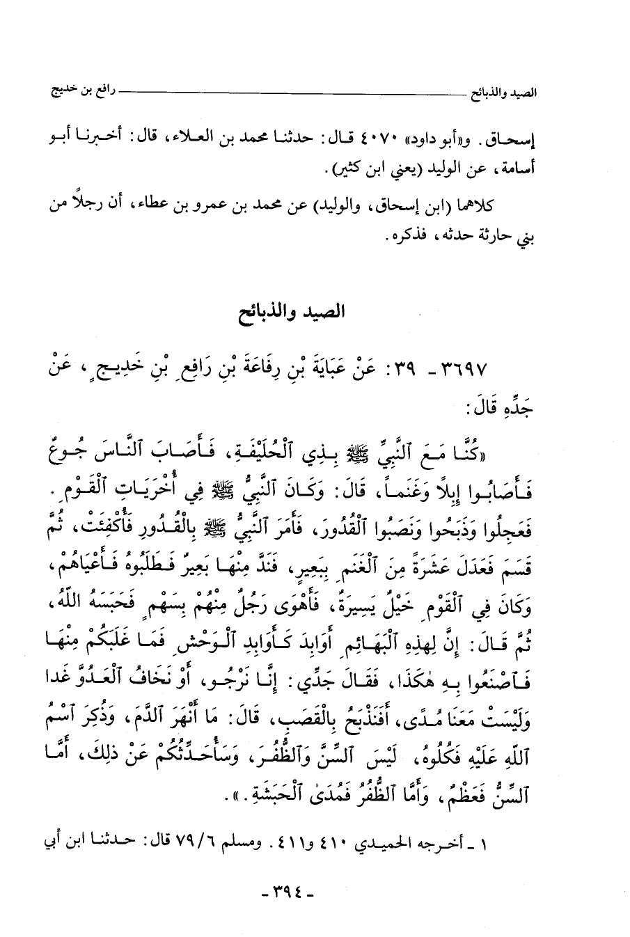 ٣٦٩٧ - عَنْ عَبَايَةَ بْنِ رِفَاعَةَ بْنِ رَافِعِ بْنِ خَدِيجٍ، عَنْ جَدِّهِ، قَالَ: