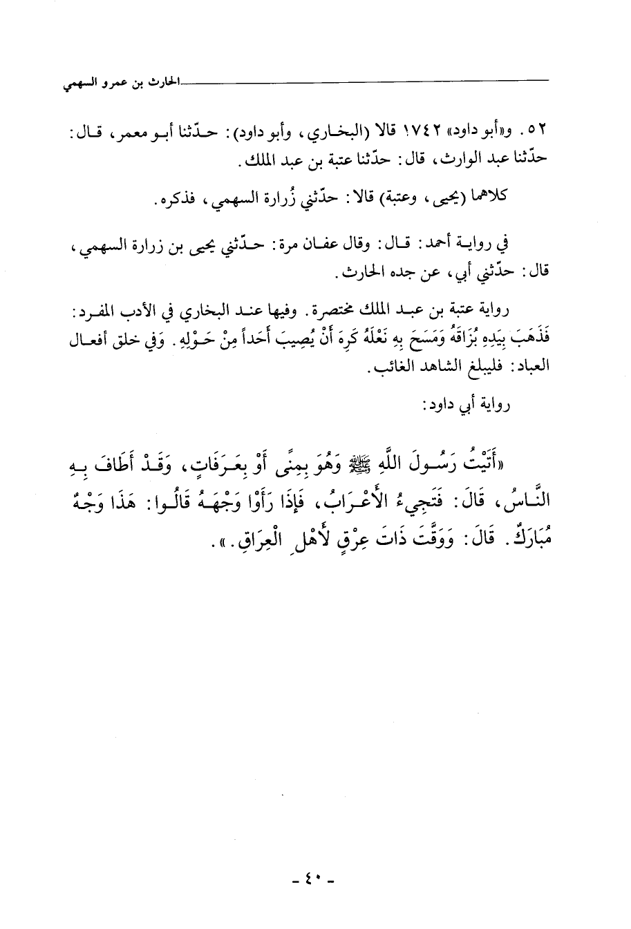 ٥٢ قال: حدَّثنا أبو مَعْمَر، قال: حدَّثنا عَبْد الوارث، قال: حدَّثنا عُتْبَة بن عَبْد الملك. و"أبو داود" ١٧٤٢ قال: حدَّثنا أبو مَعْمَر، عَبْد اللهِ بن عَمْرو بن أَبي الحَجَّاج، حدَّثنا عَبْد الوارث، حدَّثنا عُتْبَة بن عَبْد الملك السَّهْمِي. و"النَّسائي" ٧/ ١٦٨، وفي "الكبرى" ٤٥٣٨ قال: أخبرنا سُوَيْد بن نَصْر، قال: أنبأنا عَبْد اللهِ، يَعْنِي ابن المُبَارك، عن يَحيى، وهو ابن زُرَارَة بن كريم بن الحارث بن عَمْرو الباهلي. وفي ٧/ ١٦٩، وفي "الكبرى" ٤٥٣٩ قال: أخبرني هارون بن عَبْد اللهِ، قال: حدَّثنا عَفَّان، قال: حدَّثنا يَحيى بن زُرَارَة السَّهْمِي (ح) وأنبأنا هارون بن عَبْد اللهِ، قال: حدَّثنا هِشَام بن عَبْد الملك، قال: حدَّثني يَحيى بن زُرَارَة السَّهْمِي. وفي "عمل اليوم والليلة" ٤٢٠ قال: أخبرنا إِسْمَاعِيل بن مَسْعُود، قال: حدَّثنا المُعْتَمِر بن سُلَيْمَان، سَمِعْتُ يَحيى الباهلي، وهو ابن زُرَارَة بن كريم بن الحارث.