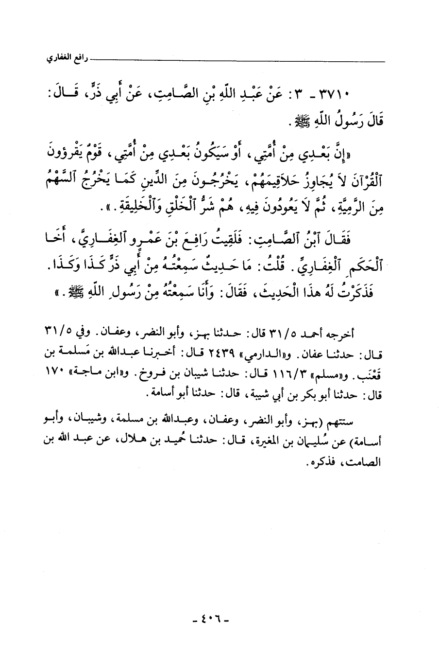 إِنَّ بَعْدِى مِنْ أُمَّتِى أَوْ سَيَكُونُ بَعْدِى مِنْ أُمَّتِى قَوْمٌ يَقْرَءُونَ الْقُرْآنَ لَا يُجَاوِزُ حَلَاقِيمَهُمْ يَخْرُجُونَ مِنَ الدِّينِ كَمَا يَخْرُجُ السَّهْمُ مِنَ الرَّمِيَّةِ ثُمَّ لَا يَعُودُونَ فِيهِ هُمْ شَرُّ الْخَلْقِ وَالْخَلِيقَةِ فَقَالَ ابْنُ الصَّامِتِ فَلَقِيتُ رَافِعَ بْنَ عَمْرٍو الْغِفَارِىَّ أَخَا الْحَكَمِ الْغِفَارِىِّ قُلْتُ مَا حَدِيثٌ سَمِعْتُهُ مِنْ أَبِى ذَرٍّ كَذَا وَكَذَا فَذَكَرْتُ لَهُ هَذَا الْحَدِيثَ فَقَالَ وَأَنَا سَمِعْتُهُ مِنْ رَسُولِ اللَّهِ صلى الله عليه وسلم.