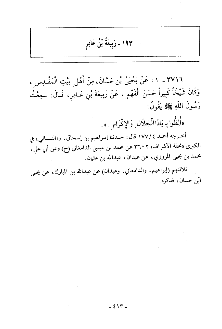 ٣٧١٦ - عَنْ يَحْيَى بْنِ حَسَّانَ، مِنْ أَهْلِ بَيْتِ الْمَقْدِسِ، وَكَانَ شَيْخًا كَبِيرًا، حَسَنَ الْفَهْمِ، عَنْ رَبِيعَةَ بْنِ عَامِرٍ، قَالَ: سَمِعْتُ رَسُولَ اللهِ صلى الله عليه وسلم يَقُولُ: