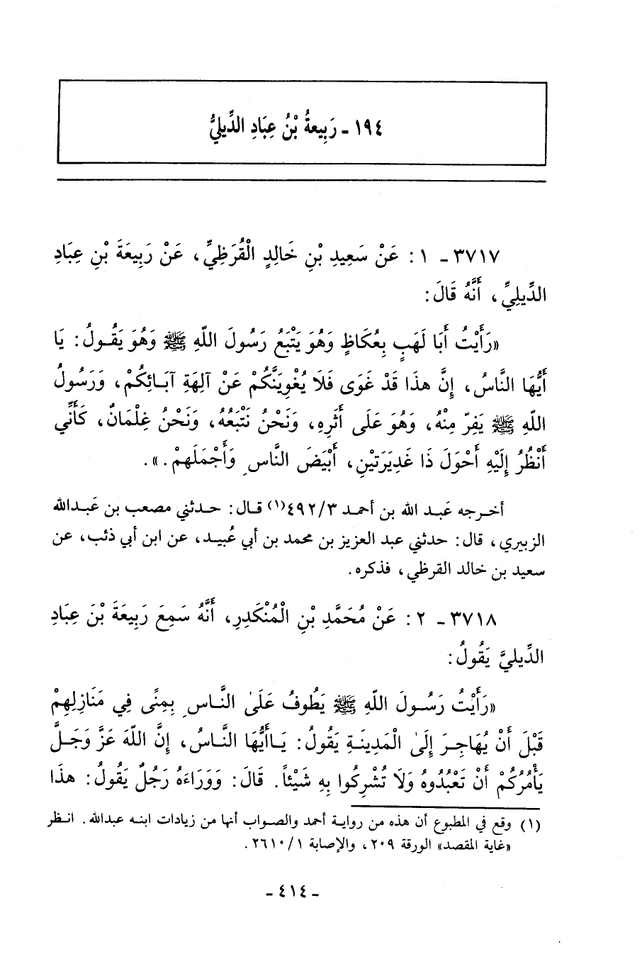 ٣٧١٧ - عَنْ سَعِيدِ بْنِ خَالِدٍ الْقَارِظِيِّ، عَنْ رَبِيعَةَ بْنِ عِبَادٍ الدِّيلِيِّ، أَنَّهُ قَالَ: