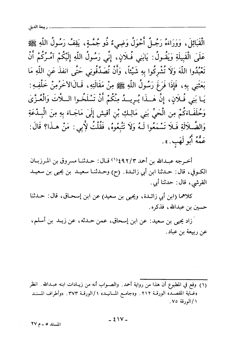 الْقَبَائِلَ، وَوَرَاءَهُ رَجُلٌ أَحْوَلُ، وَضِيءٌ، ذُو جُمَّةٍ، يَقِفُ رَسُولُ اللهِ صلى الله عليه وسلم عَلَى الْقَبِيلَةِ، فَيَقُولُ: يَا بَنِي فُلَانٍ، إِنِّي رَسُولُ اللهِ إِلَيْكُمْ، آمُرُكُمْ أَنْ تَعْبُدُوا اللهَ، وَلَا تُشْرِكُوا بِهِ شَيْئًا، وَأَنْ تُصَدِّقُونِي حَتَّى أُنْفِذَ عَنِ اللهِ مَا بَعَثَنِي بِهِ، فَإِذَا فَرَغَ رَسُولُ اللهِ صلى الله عليه وسلم مِنْ مَقَالَتِهِ، قَالَ الآخَرُ مِنْ خَلْفِهِ: يَا بَنِي فُلَانٍ، إِنَّ هَذَا يُرِيدُ مِنْكُمْ أَنْ تَسْلُخُوا اللَاّتَ وَالْعُزَّى، وَحُلَفَاءَكُمْ مِنَ الْحَيِّ بَنِي مَالِكِ بْنِ أُقَيْشٍ، إِلَى مَا جَاءَ بِهِ مِنَ الْبِدْعَةِ وَالضَّلَالَةِ، فَلَا تَسْمَعُوا لَهُ وَلَا تَتَّبِعُوهُ، فَقُلْتُ لأَبِي: مَنْ هَذَا؟ قَالَ: عَمُّهُ أَبُو لَهَبٍ.