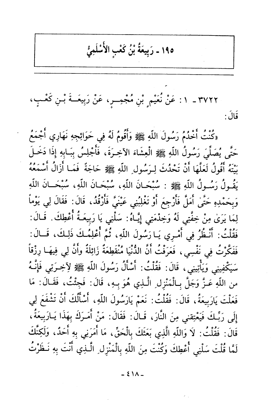 كُنْتُ أَخْدُمُ رَسُولَ اللهِ صلى الله عليه وسلم، وَأَقُومُ لَهُ فِي حَوَائِجِهِ، نَهَارِي أَجْمَعَ، حَتَّى يُصَلِّيَ رَسُولُ اللهِ صلى الله عليه وسلم الْعِشَاءَ الآخِرَةَ، فَأَجْلِسَُ بِبَابِهِ، إِذَا دَخَلَ بَيْتَهُ، أَقُولُ لَعَلَّهَا أَنْ تَحْدُثَ لِرَسُولِ اللهِ صلى الله عليه وسلم حَاجَةٌ، فَمَا أَزَالُ أَسْمَعُهُ يَقُولُ رَسُولُ اللهِ صلى الله عليه وسلم: سُبْحَانَ اللهِ، سُبْحَانَ اللهِ، سُبْحَانَ اللهِ وَبِحَمْدِهِ، حَتَّى أَمَلَّ، فَأَرْجِعَ، أَوْ تَغْلِبَنِي عَيْنِي، فَأَرْقُدَُ، قَالَ: فَقَالَ لِي يَوْمًا، لِمَا يَرَى مِنْ خِفَّتِي لَهُ وَخِدْمَتِي إِيَّاهُ: سَلْنِي يَا رَبِيعَة، أُعْطِكَ. قَالَ: فَقُلْتُ: أَنْظُرُ فِي أَمْرِي، يَا رَسُولَ اللهِ، ثُمَّ أُعْلِمُكَ ذَلِكَ، قَالَ: فَفَكَّرْتُ فِي نَفْسِي، فَعَرَفْتُ أَنَّ الدُّنْيَا مُنْقَطِعَةٌ وَزَائِلَةٌ، وَأَنَّ لِي فِيهَا رِزْقًا سَيَكْفِينِي وَيَأْتِينِي، قَالَ: فَقُلْتُ: أَسْأَلُ رَسُولَ اللهِ صلى الله عليه وسلم لآخِرَتِي، فَإِنَّهُ مِنَ اللهِ، عَزَّ وَجَلَّ، بِالْمَنْزِلِ الَّذِي هُوَ بِهِ، قَالَ: فَجِئْتُ، فَقَالَ: مَا فَعَلْتَ يَا رَبِيعَة؟ قَالَ: فَقُلْتُ: نَعَمْ، يَا رَسُولَ اللهِ، أَسْأَلُكَ أَنْ تَشْفَعَ لِي إِلَى رَبِّكَ، فَيُعْتِقَنِي مِنَ النَّارِ، قَالَ: فَقَالَ: مَنْ أَمَرَكَ بِهَذَا يَا رَبِيعَة؟ قَالَ: فَقُلْتُ: لَا وَاللهِ، الَّذِي بَعَثَكِ بِالْحَقِّ، مَا أَمَرَنِي بِهِ أَحَدٌ، وَلَكِنَّكَ لَمَّا قُلْتَ: سَلْنِي، أُعْطِكَ، وَكُنْتَ مِنَ اللهِ بِالْمَنْزِلِ الَّذِي أَنْتَ بِهِ، نَظَرْتُ
