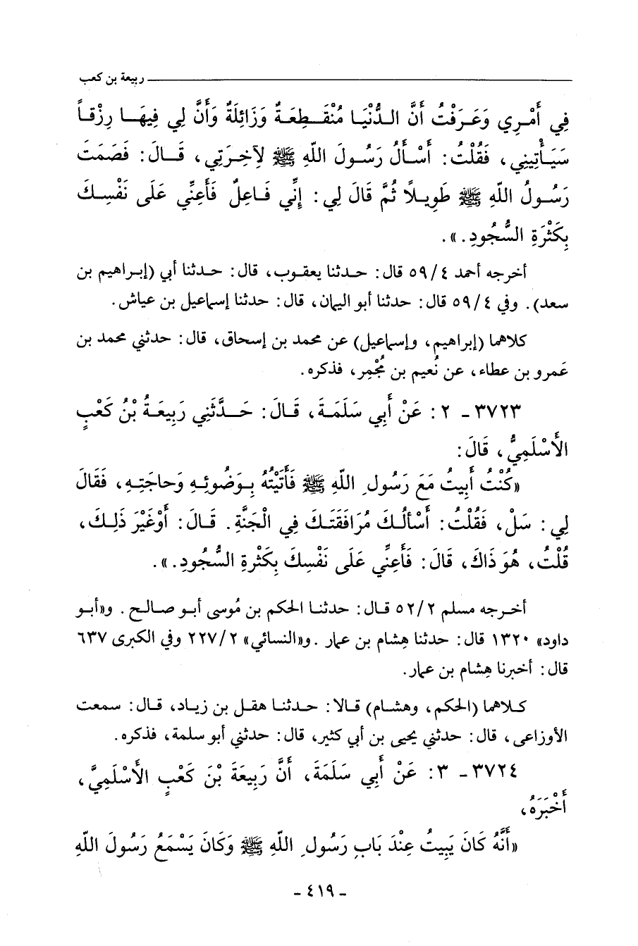 ٣٧٢٣ - عَنْ أَبِي سَلَمَةَ، قَالَ: حَدَّثَنِي رَبِيعَةُ بْنُ كَعْبٍ الأَسْلَمِيُّ، قَالَ:
