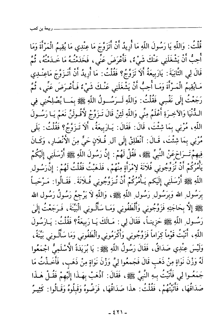 قُلْتُ: وَاللهِ، يَا رَسُولَ اللهِ، مَا أُرِيدُ أَنْ أَتَزَوَّجَ، مَا عِنْدِي مَا يُقِيمُ الْمَرْأَةَ، وَمَا أُحِبُّ أَنْ يَشْغَلَنِي عَنْكَ شَيْءٌ، فَأَعْرَضَ عَنِّي، فَخَدَمْتُهُ مَا خَدَمْتُهُ، ثُمَّ قَالَ لِيَ الثَّانِيَةَ: يَا رَبِيعَةُ، أَلَا تَزَوَّجُ؟ فَقُلْتُ: مَا أُرِيدُ أَنْ أَتَزَوَّجَ، مَا عِنْدِي مَا يُقِيمُ الْمَرْأَةَ، وَمَا أُحِبُّ أَنْ يَشْغَلَنِي عَنْكَ شَيْءٌ، فَأَعْرَضَ عَنِّي، ثُمَّ رَجَعْتُ إِلَى نَفْسِي، فَقُلْتُ: وَاللهِ، لَرَسُولُ اللهِ صلى الله عليه وسلم بِمَا يُصْلِحُنِي فِي الدُّنْيَا وَالآخِرَةِ أَعْلَمُ مِنِّي، وَاللهِ، لَئِنْ قَالَ: تَزَوَّجْ، لأَقُولَنَّ: نَعَمْ، يَا رَسُولَ اللهِ، مُرْنِي بِمَا شِئْتَ، قَالَ: فَقَالَ: يَا رَبِيعَةُ، أَلا تَزَوَّجُ؟ فَقُلْتُ: بَلَى، مُرْنِي بِمَا شِئْتَ، قَالَ: انْطَلِقْ إِلَى آلِ فُلَانٍ، حَيٍّ مِنَ الأَنْصَارِ، وَكَانَ فِيهِمْ تَرَاخٍ عَنِ النَّبِيِّ صلى الله عليه وسلم، فَقُلْ لَهُمْ: إِنَّ رَسُولَ اللهِ صلى الله عليه وسلم أَرْسَلَنِي إِلَيْكُمْ، يَأْمُرُكُمْ أَنْ تُزَوِّجُونِي فُلَانَةَ، لاِمْرَأَةٍ مِنْهُمْ، فَذَهَبْتُ، فَقُلْتُ لَهُمْ: إِنَّ رَسُولَ اللهِ صلى الله عليه وسلم أَرْسَلَنِي إِلَيْكُمْ، يَأْمُرُكُمْ أَنْ تُزَوِّجُونِي فُلَانَةَ، فَقَالُوا: مَرْحَبًا بِرَسُولِ اللهِ، وَبِرَسُولِ رَسُولِ اللهِ صلى الله عليه وسلم، وَاللهِ، لَا يَرْجِعُ رَسُولُ رَسُولِ اللهِ صلى الله عليه وسلم إِلَاّ بِحَاجَتِهِ، فَزَوَّجُونِي وَأَلْطَفُونِي، وَمَا سَأَلُونِي الْبَيِّنَةَ،