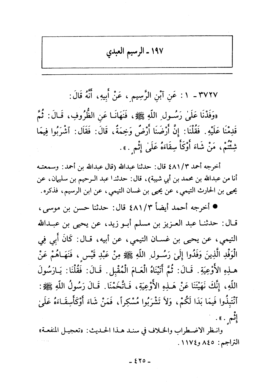 كَانَ أَبِي فِي الْوَفْدِ الَّذِينَ وَفَدُوا إِلَى رَسُولِ اللهِ صلى الله عليه وسلم، مِنْ عَبْد قَيْس، فَنَهَاهُمْ عَنْ هَذِهِ الأَوْعِيَةِ، قَالَ: فَأَتْخَمْنَا، ثُمَّ أَتَيْنَاهُ الْعَامَ الْمُقْبِلَ، قَالَ: فَقُلْنَا: يَا رَسُولَ اللهِ، إِنَّكَ نَهَيْتَنَا عَنْ هَذِهِ الأَوْعِيَةِ، فَأَتْخَمْنَا، قَالَ رَسُولُ اللهِ صلى الله عليه وسلم: انْتَبِذُوا فِيمَا بَدَا لَكُمْ، وَلا تَشْرَبُوا مُسْكِرًا، فَمَنْ شَاءَ أَوْكَأَ سِقَاءَهُ عَلَى إِثْمٍ.