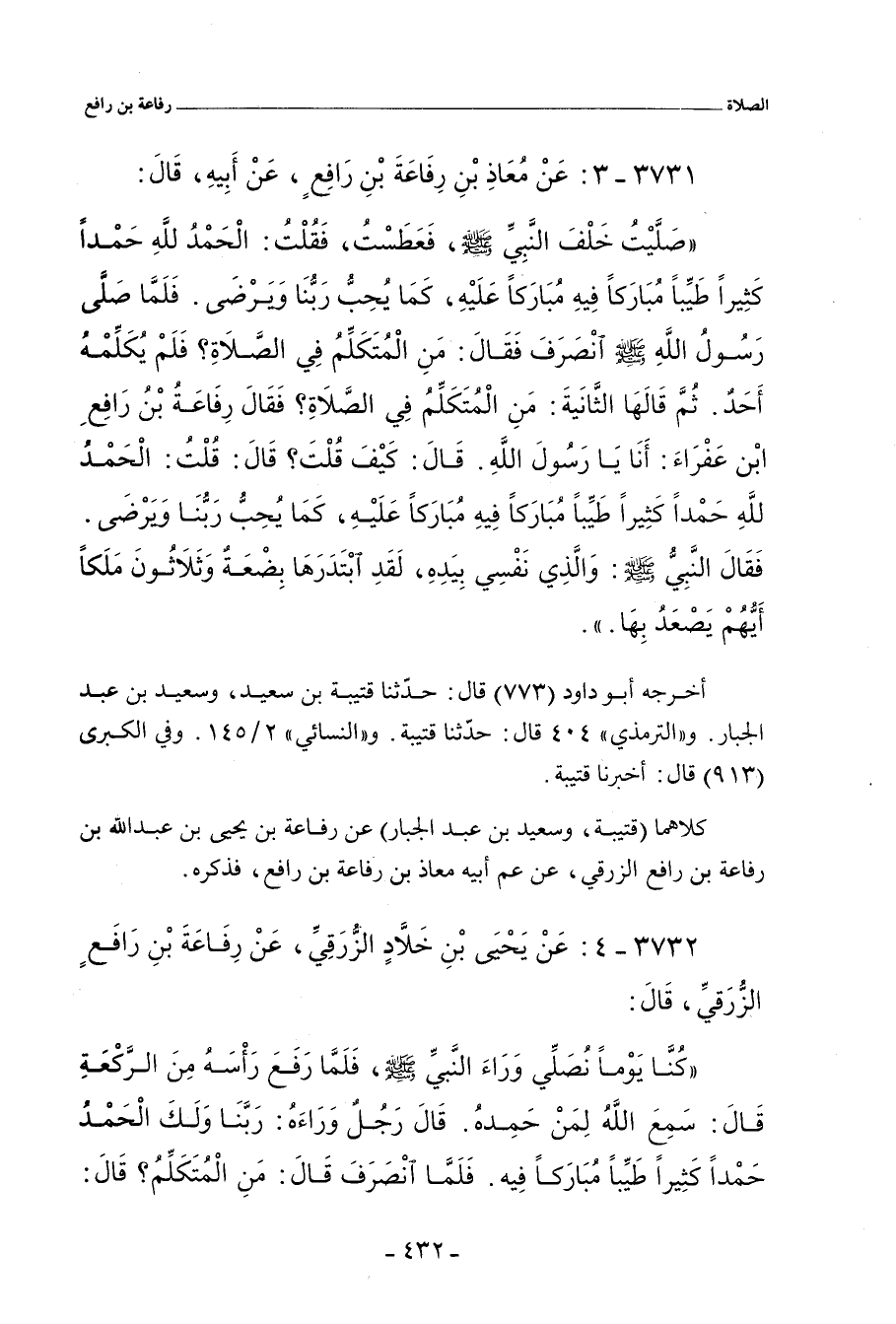 صَلَّيْتُ خَلْفَ النَّبِيِّ صلى الله عليه وسلم، فَعَطَسْتُ، فَقُلْتُ: الْحَمْدُ ِللهِ، حَمْدًا كَثِيرًا طَيِّبًا مُبَارَكًا فِيهِ، مُبَارَكًا عَلَيْهِ، كَمَا يُحِبُّ رَبُّنَا وَيَرْضَى، فَلَمَّا صَلَّى رَسُولُ اللهِ صلى الله عليه وسلم، انْصَرَفَ، فَقَالَ: مَنِ الْمُتَكَلِّمُ فِي الصَّلَاةِ؟ فَلَمْ يُكَلِّمْهُ أَحَدٌ، ثُمَّ قَالَهَا الثَّانِيَةَ: مَنِ الْمُتَكَلِّمُ فِي الصَّلَاةِ؟ فَقَالَ رِفَاعَةُ بْنُ رَافِعِ بْنِ عَفْرَاءَ: أَنَا يَا رَسُولَ اللهِ، قَالَ: كَيْفَ قُلْتَ؟ قَالَ: قُلْتُ: الْحَمْدُ ِللهِ، حَمْدًا كَثِيرًا طَيِّبًا مُبَارَكًا فِيهِ، مُبَارَكًا عَلَيْهِ، كَمَا يُحِبُّ رَبُّنَا وَيَرْضَى، فَقَالَ النَّبِيُّ صلى الله عليه وسلم: وَالَّذِي نَفْسِي بِيَدِهِ، لَقَدِ ابْتَدَرَهَا بِضْعَةٌ وَثَلَاثُونَ مَلَكًا، أَيُّهُمْ يَصْعَدُ بِهَا.