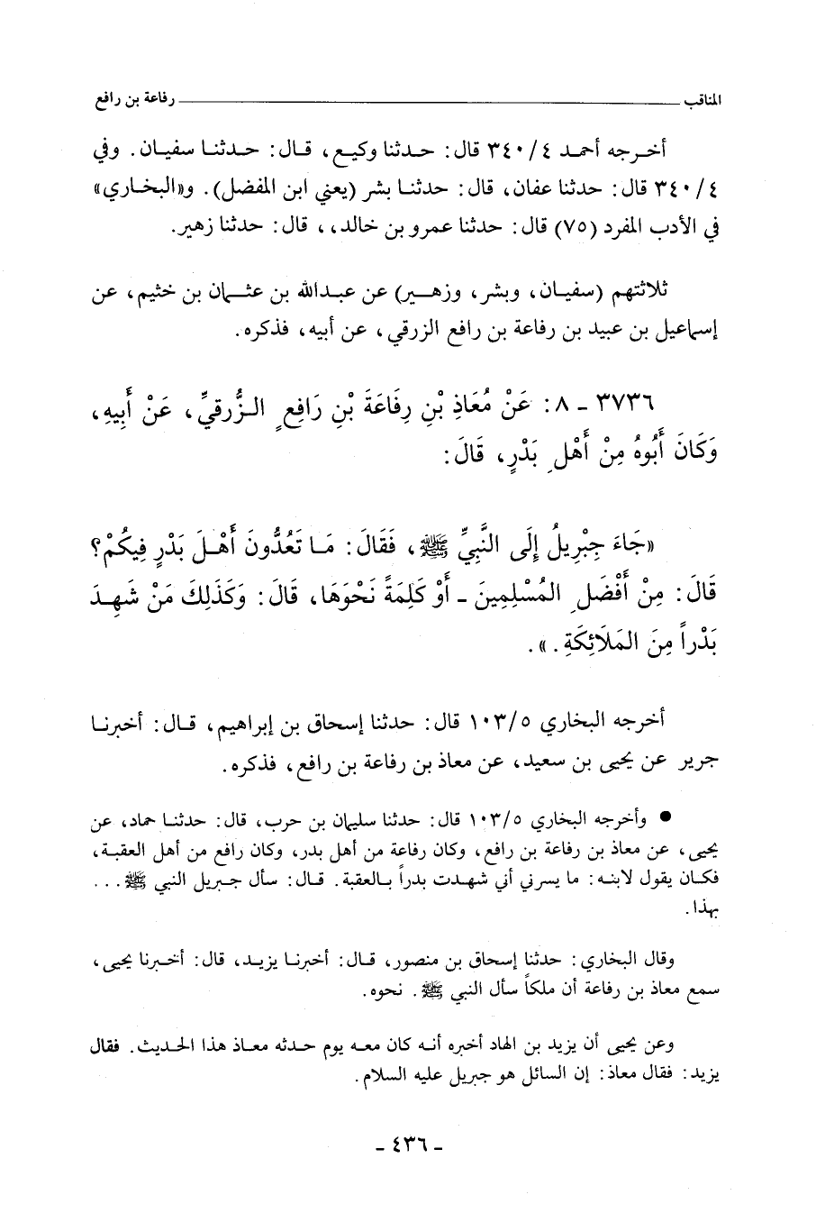 ٣٧٣٦ - عَنْ مُعَاذِ بْنِ رِفَاعَةَ بْنِ رَافِعٍ الزُّرَقِيِّ، عَنْ أَبِيهِ، وَكَانَ أَبُوهُ مِنْ أَهْلِ بَدْرٍ، قَالَ: