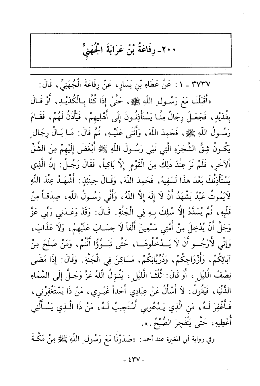 أَقْبَلْنَا مَعَ رَسُولِ اللهِ صلى الله عليه وسلم، حَتَّى إِذَا كُنَّا بِالْكَدِيدِ، أَوْ قَالَ: بِقُدَيْدٍ، فَجَعَلَ رِجَالٌ مِنَّا يَسْتَأْذِنُونَ إِلَى أَهْلِيهِمْ، فَيَأْذَنُ لَهُمْ، فَقَامَ رَسُولُ اللهِ صلى الله عليه وسلم، فَحَمِدَ اللهَ وَأَثْنَى عَلَيْهِ، ثُمَّ قَالَ: مَا بَالُ رِجَالٍ يَكُونُ شِقُّ الشَّجَرَةِ الَّتِي تَلِي رَسُولَ اللهِ صلى الله عليه وسلم، أَبْغَضَ إِلَيْهِمْ مِنَ الشِّقِّ الآخَرِ، فَلَمْ نَرَ عِنْدَ ذَلِكَ مِنَ الْقَوْمِ إِلَاّ بَاكِيًا، فَقَالَ رَجُلٌ: إِنَّ الَّذِي يَسْتَأْذِنُكَ بَعْدَ هَذَا لَسَفِيهٌ، فَحَمِدَ اللهَ، وَقَالَ حِينَئِذٍ: أَشْهَدُ عِنْدَ اللهِ، لَا يَمُوتُ عَبْد، يَشْهَدُ أَنْ لَا إِلَهَ إِلَاّ اللهُ، وَأَنِّي رَسُولُ اللهِ، صِدْقًا مِنْ قَلْبِهِ، ثُمَّ يُسَدِّدُ، إِلَاّ سُلِكَ فِي الْجَنَّةِ. قَالَ: وَقَدْ وَعَدَنِي رَبِّي، عَزَّ وَجَلَّ، أَنْ يُدْخِلَ مِنْ أُمَّتِي سَبْعِينَ أَلْفًا لَا حِسَابَ عَلَيْهِمْ، وَلَا عَذَابَ، وَإِنِّي لأَرْجُو أَنْ لَا يَدْخُلُوهَا، حَتَّى تَبَوَّؤُوا أَنْتُمْ، وَمَنْ صَلَحَ مِنْ آبَائِكُمْ، وَأَزْوَاجِكُمْ، وَذُرِّيَّاتِكُمْ، مَسَاكِنَ فِي الْجَنَّةِ. وَقَالَ: إِذَا مَضَى نِصْفُ اللَّيْلِ، أَوْ قَالَ: ثُلُثَا اللَّيْلِ، يَنْزِلُ اللهُ، عَزَّ وَجَلَّ، إِلَى السَّمَاءِ الدُّنْيَا، فَيَقُولُ: لَا أَسْأَلُ عَنْ عِبَادِي أَحَدًا غَيْرِي، مَنْ ذَا الَّذِي يَسْتَغْفِرُنِي، فَأَغْفِرَ لَهُ، مَنْ ذَا الَّذِي يَدْعُونِي أَسْتَجِيبُ لَهُ، مَنْ ذَا الَّذِي يَسْأَلُنِي أُعْطِيهِ، حَتَّى يَنْفَجِرَ الصُّبْحُ.