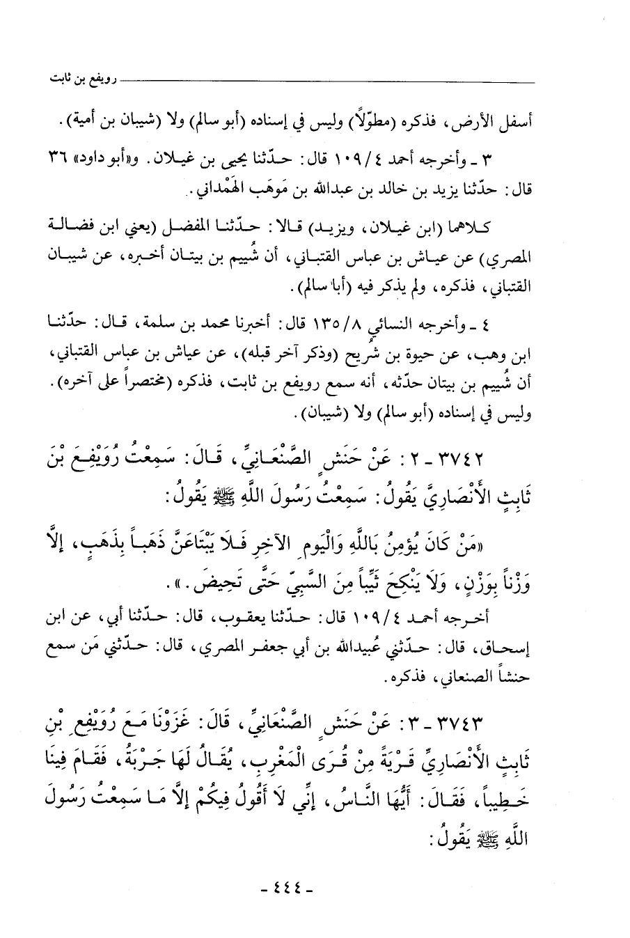 ٣٧٤٢ - عَنْ حَنَشٍ الصَّنْعَانِيِّ، قَالَ: سَمِعْتُ رُوَيْفِعَ بْنَ ثَابِتٍ الأَنْصَارِيَّ يَقُولُ: سَمِعْتُ رَسُولَ اللهِ صلى الله عليه وسلم يَقُولُ: