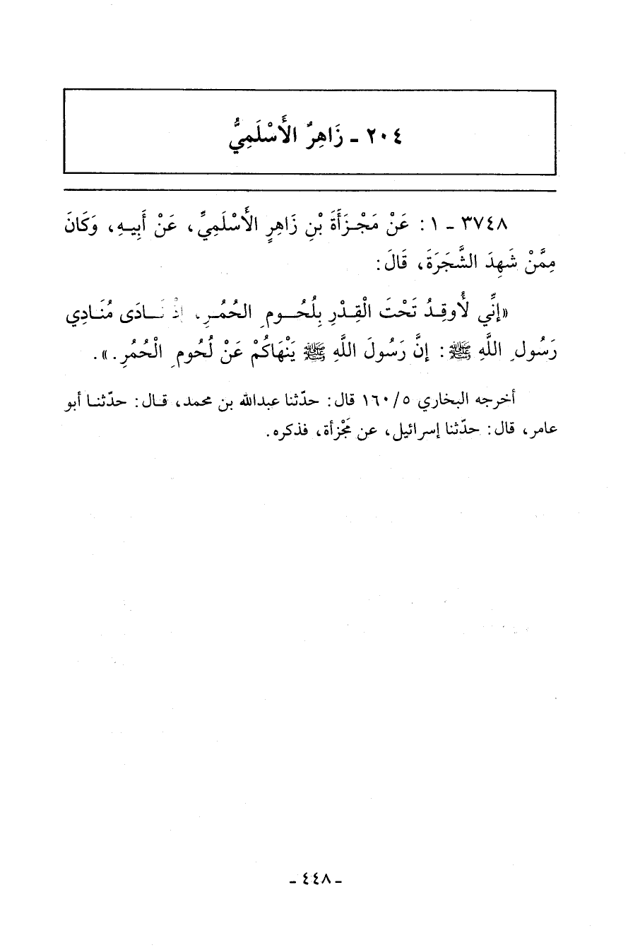 ٣٧٤٨ - عَنْ مَجْزَأَةَ بْنِ زَاهِرٍ الأَسْلَمِيِّ، عَنْ أَبِيهِ، وَكَانَ مِمَّنْ شَهِدَ الشَّجَرَةَ، قَالَ: