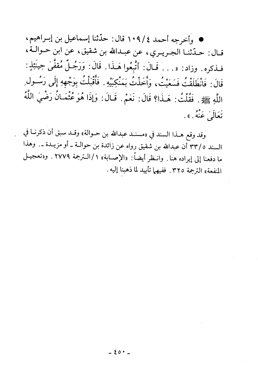 - أخرجه أحمد ٤/ ١٠٩ (١٧١٢٩) قال: حدَّثنا إِسْمَاعِيل بن إبراهيم، قال: حدَّثنا الجُرَيْرِي، عَنْ عَبْدِ اللهِ بْنِ شَقِيقٍ، عَنِ ابْنِ حَوَالَةَ، قَالَ: