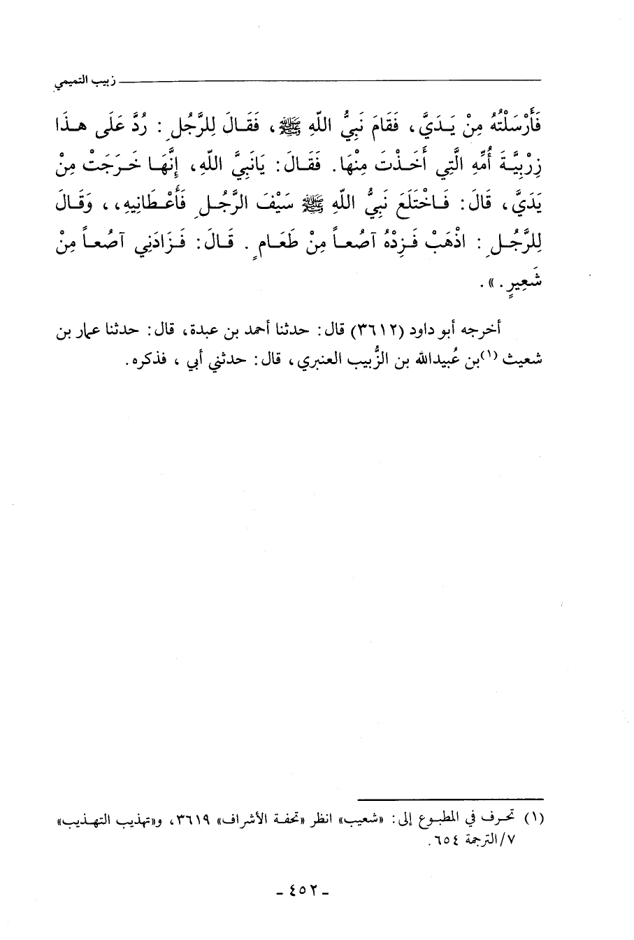 أخرجه أبو داود (٣٦١٢) قال: حدَّثنا أحمد بن عَبْدَة، قال: حدَّثنا عَمَّار بن شُعَيْث بن عُبَيْد اللهِ بن الزُّبَيْب العَنْبَرِي، قال: حدَّثني أَبِي، فذكره.