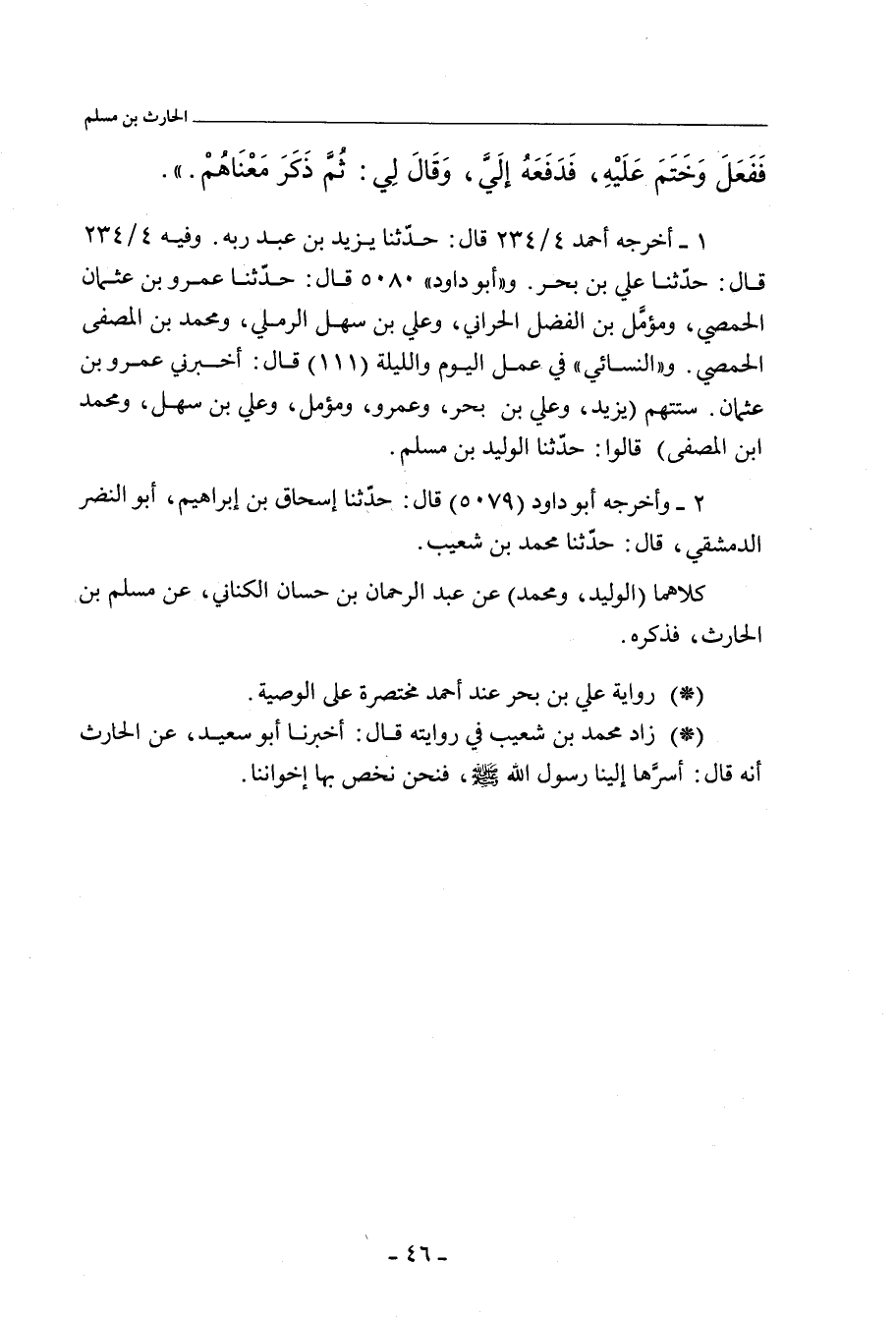 كلاهما (الوَلِيد، ومُحَمَّد بن شُعَيْب) عن أَبي سَعِيد الفِلَسْطِينِي، عَبْد الرَّحْمان بن حَسَّان، عن الحارث بن مُسْلم، أنه أخبره، عن أبيه مُسْلم بن الحارث التَّمِيمِي، عن النَّبِيِّ صلى الله عليه وسلم، فذكره.