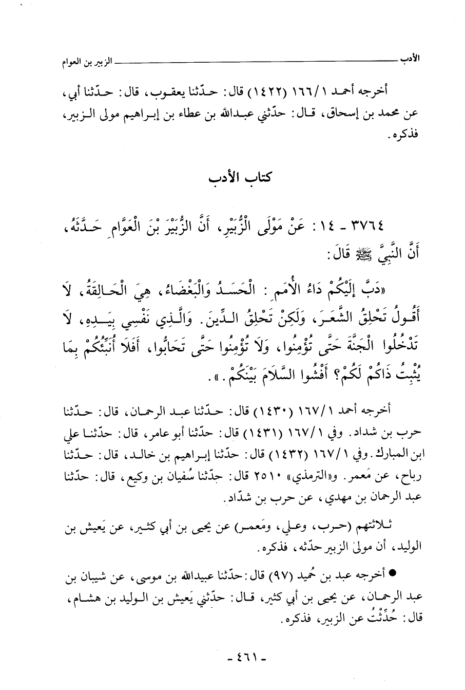 أخرجه أحمد ١/ ١٦٧ (١٤٣٠) قال: حدَّثنا عَبْد الرَّحْمان، قال: حدَّثنا حَرْب بن شَدَّاد. وفي (١٤٣١) قال: حدَّثنا أبو عامر، قال: حدَّثنا علي بن المُبَارك. والتِّرْمِذِيّ" ٢٥١٠ قال: حدَّثنا سُفْيان بن وَكِيع، قال: حدَّثنا عَبْد الرَّحْمان بن مَهْدِي، عن حَرْب بن شَدَّاد , عن يَحيى بن أَبِي كَثِير، عن يَعِيش بن الوَلِيد، أن مَوْلَى الزُّبَيْر حَدَّثه، فذكره.