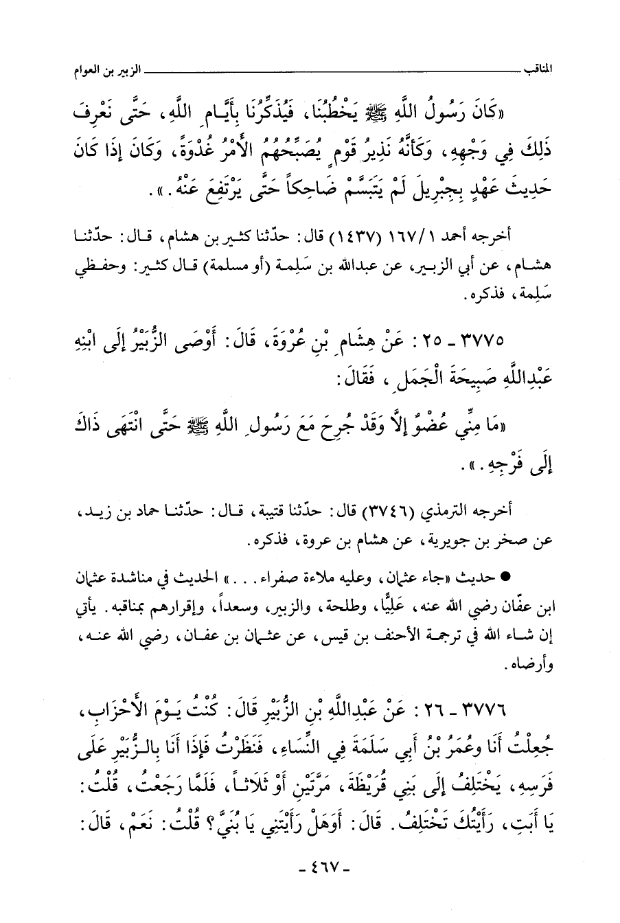حديث (جاء عثمان , وعليه ملاءة صفراء. الحديث في مناشدة عثمان بن عفان رضي الله عنه , عليا , وطلحة , والزبير , وسعدا , وإقرارهم بمناقبه. يأتي إن شاء الله في ترجمة الأحنف بن قيس, عن عثمان بن عفان , رضي الله عنه , وأرضاه.
