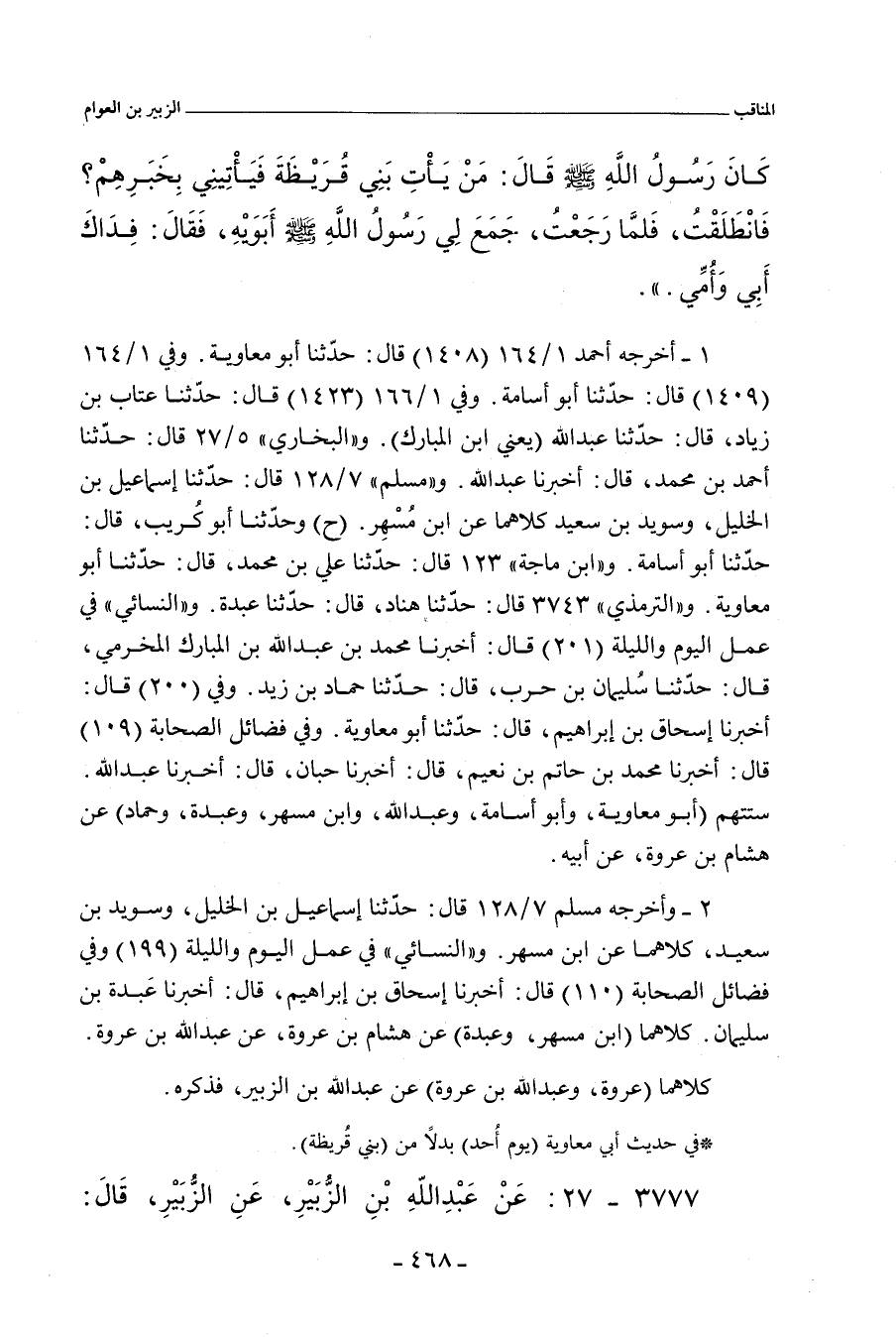 - في رواية علي بن مُسْهِر، عن هِشَام بن عُرْوَة. قال هِشَام: وأخبرني عَبْد اللهِ بن عُرْوَة، عَنْ عَبْد اللهِ بْنِ الزُّبَيْر. قَالَ: فَذَكَرْتُ ذَلِكَ لأَبِي، فَقَالَ:. وَرَأَيْتَنِي يَا بُنَيَّ؟ قُلْتُ: نَعَمْ، قَالَ: أَمَا وَاللهِ، لَقَدْ جَمَعَ لِي رَسُولُ اللهِ صلى الله عليه وسلم يَوْمَئذٍ أَبَوَيْهِ، فَقَالَ: فِدَاكَ أَبِي وَأُمِّي.