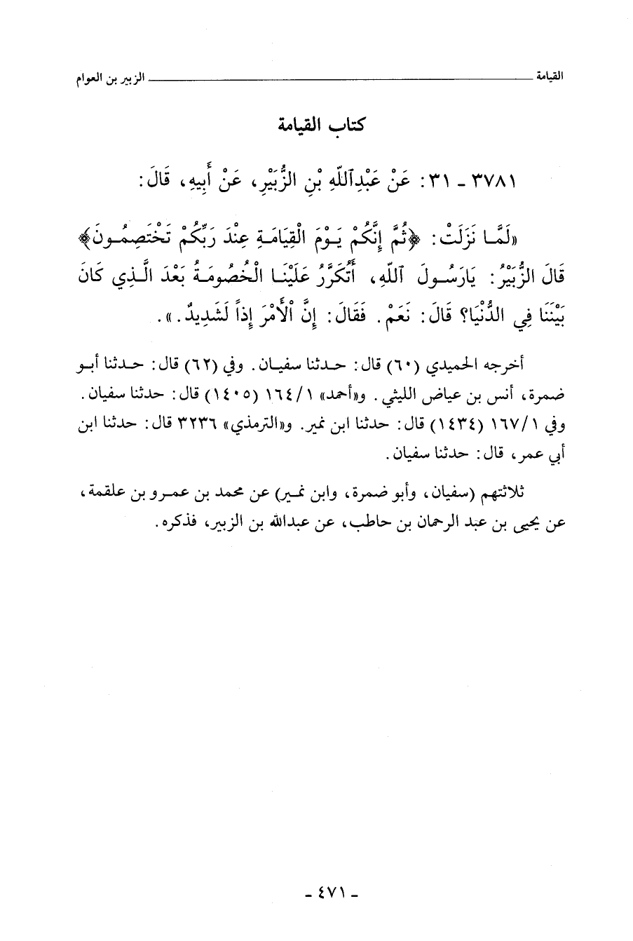لَمَّا نَزَلَتْ: (ثُمَّ إِنَّكُمْ يَوْمَ الْقِيَامَةِ عِنْدَ رَبِّكُمْ تَخْتَصِمُونَ) قَالَ الزُّبَيْر: يَا رَسُولَ اللهِ، أَتُكَرَّرُ عَلَيْنَا الْخُصُومَةُ بَعْدَ الَّذِي كَانَ بَيْنَنَا فِي الدُّنْيَا؟ قَالَ: نَعَمْ، فَقَالَ: إِنَّ الأَمْرَ إِذًا لَشَدِيدٌ.