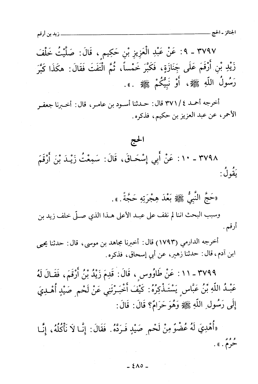 ٣٧٩٧ - عَنْ عَبْدِ الْعَزِيزِ بْنِ حَكِيمٍ، قَالَ: صَلَّيْتُ خَلْفَ زَيْدِ بْنِ أَرْقَمَ عَلَى جَِنَازَةٍ، فَكَبَّرَ خَمْسًا، ثُمَّ الْتَفَتَ، فَقَالَ: