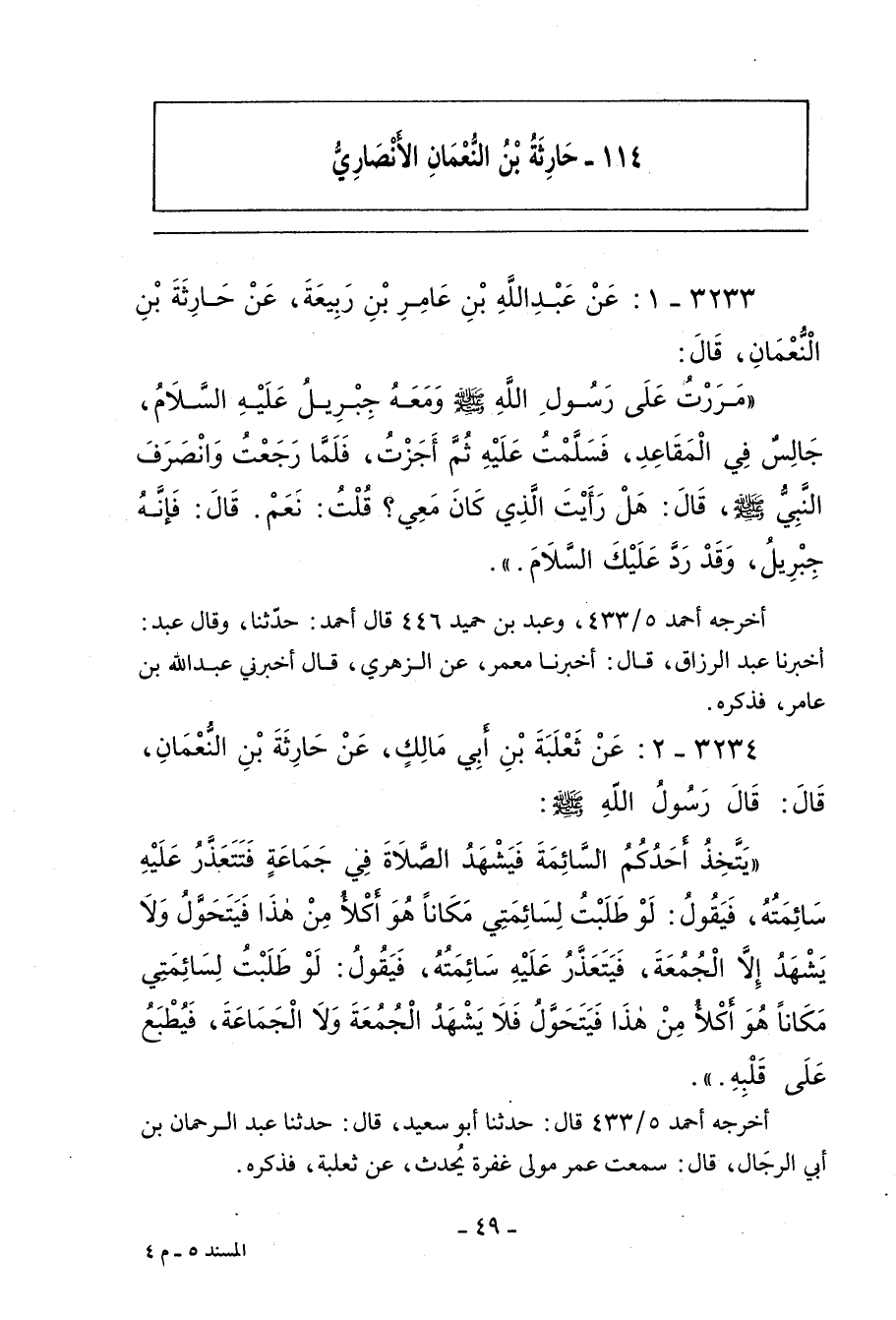 - أخرجه أحمد ٤/ ١٧ (١٦٣٢٠) قال: حدَّثنا عَفَّان، قال: حدَّثنا وُهَيْب، قال: حدَّثنا مُوسَى بن عُقْبَة، قَالَ: حَدَّثَنِي أَبُو سَلَمَةَ، عَنِ الرَّجُلِ الَّذِي مَرَّ بِرَسُولِ اللهِ صلى الله عليه وسلم، وَهُوَ يُنَاجِي جِبْرِيلَ، عَلَيْهِ السَّلَامُ، فَزَعَمَ أَبُو سَلَمَةَ، أَنَّهُ تَجَنَّبَ أَنْ يَدْنُوَ مِنْ رَسُولِ اللهِ صلى الله عليه وسلم، تَخَوُّفًا أَنْ يَسْمَعَ حَدِيثَهُ، فَلَمَّا أَصْبَحَ، قَالَ لَهُ رَسُولُ اللهِ صلى الله عليه وسلم: مَا مَنَعَكَ أَنْ تُسَلِّمَ، إِذْ مَرَرْتَ بِي الْبَارِحَةَ؟ قَالَ: رَأَيْتُكَ تُنَاجِي رَجُلاً، فَخَشِيتُ أَنْ تَكْرَهَ أَنْ أَدْنُوَ مِنْكُمَا. قَالَ: وَهَلْ تَدْرِي مَنِ الرَّجُلُ؟ قَالَ: لَا. قَالَ: فَذَلِكَ جِبْرِيلُ، عَلَيْهِ السَّلَامُ، وَلَوْ سَلَّمْتَ لَرَدَّ السَّلَامَ.