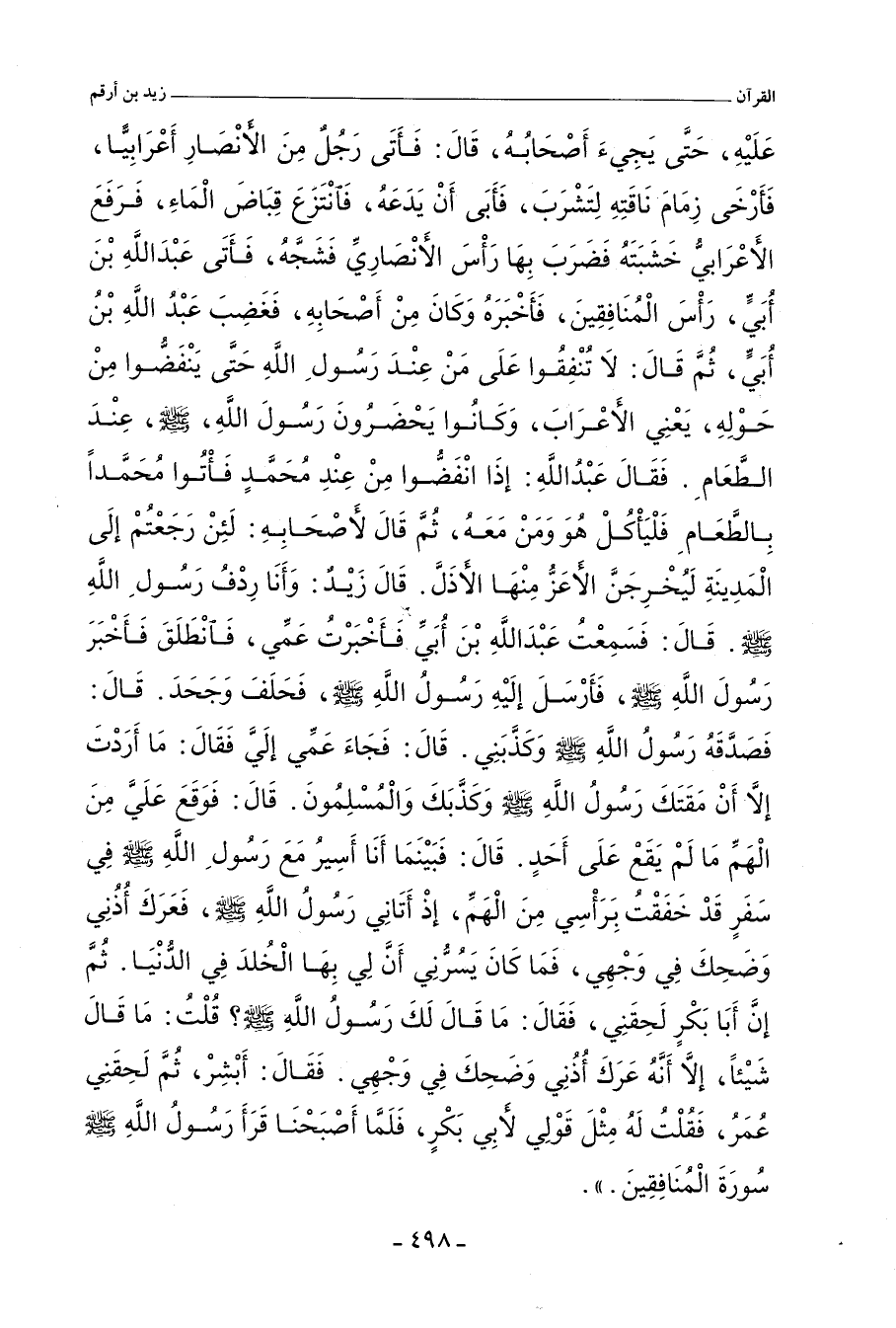 عَلَيْهِ، حَتَّى يَجِيءَ أَصْحَابُهُ، قَالَ: فَأَتَى رَجُلٌ مِنَ الأَنْصَار أَعْرَابِيًّا، فَأَرْخَى زِمَامَ نَاقَتِهِ لِتَشْرَبَ، فَأَبَى أَنْ يَدَعَهُ، فَانْتَزَعَ قِبَاضَ الْمَاءِ، فَرَفَعَ الأَعْرَابِيُّ خَشَبَتَهُ، فَضَرَبَ بِهَا رَأْسَ الأَنْصَارِيِّ فَشَجَّهُ، فَأَتَى عَبْدَ اللهِ بْنَ أُبَيٍّ، رَأْسَ الْمُنَافِقِينَ، فَأَخْبَرَهُ، وَكَانَ مِنْ أَصْحَابِهِ، فَغَضِبَ عَبْدُ اللهِ بْنُ أُبَيٍّ، ثُمَّ قَالَ: لَا تُنْفِقُوا عَلَى مَنْ عِنْدَ رَسُولِ اللهِ حَتَّى يَنْفَضُّوا مِنْ حَوْلِهِ، يَعْنِي الأَعْرَابَ، وَكَانُوا يَحْضُرُونَ رَسُولَ اللهِ صلى الله عليه وسلم عِنْدَ الطَّعَامِ، فَقَالَ عَبْدُ اللهِ: إِذَا انْفَضُّوا مِنْ عِنْدِ مُحَمَّدٍ، فَأْتُوا مُحَمَّدًا بِالطَّعَامِ، فَلْيَأْكُلْ هُوَ وَمَنْ مَعَهُ، ثُمَّ قَالَ لأَصْحَابِهِ: لَئِنْ رَجَعْتُمْ إِلَى الْمَدِينَةِ لَيُخْرِجَنَّ الأَعَزُّ مِنْهَا الأَذَلَّ، قَالَ زَيْدٌ: وَأَنَا رِدْفُ رَسُولِ اللهِ صلى الله عليه وسلم، قَالَ: فَسَمِعْتُ عَبْدَ اللهِ بْنَ أُبَيٍّ، فَأَخْبَرْتُ عَمِّي، فَانْطَلَقَ فَأَخْبَرَ رَسُولَ اللهِ صلى الله عليه وسلم، فَأَرْسَلَ إِلَيْهِ رَسُولُ اللهِ صلى الله عليه وسلم، فَحَلَفَ وَجَحَدَ، قَالَ: فَصَدَّقَهُ رَسُولُ اللهِ صلى الله عليه وسلم وَكَذَّبَنِي، قَالَ: فَجَاءَ