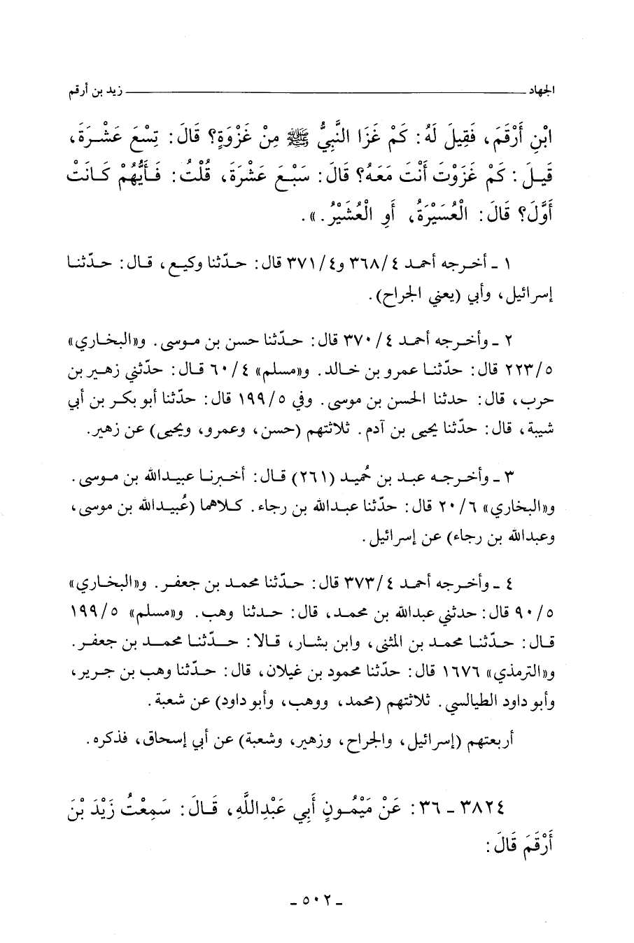 بْنِ أَرْقَمَ، فَقِيلَ لَهُ: كَمْ غَزَا النَّبِيُّ صلى الله عليه وسلم مِنْ غَزْوَةٍ؟ قَالَ: تِسْعَ عَشْرَةَ، قِيلَ: كَمْ غَزَوْتَ أَنْتَ مَعَهُ؟ قَالَ: سَبْعَ عَشْرَةَ، قُلْتُ: فَأَيُّهُمْ كَانَتْ أَوَّلَ؟ قَالَ: الْعُسَيْرَةُ، أَوِ الْعُشَيْرُ.