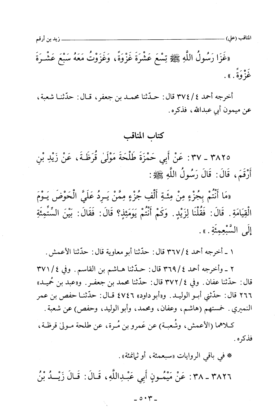 ٣٨٢٥ - عَنْ أَبِي حَمْزَةَ، طَلْحَةَ، مَوْلَى قَرَظَةَ، عَنْ زَيْدِ بْنِ أَرْقَمَ، قَالَ: قَالَ رَسُولُ اللهِ صلى الله عليه وسلم: