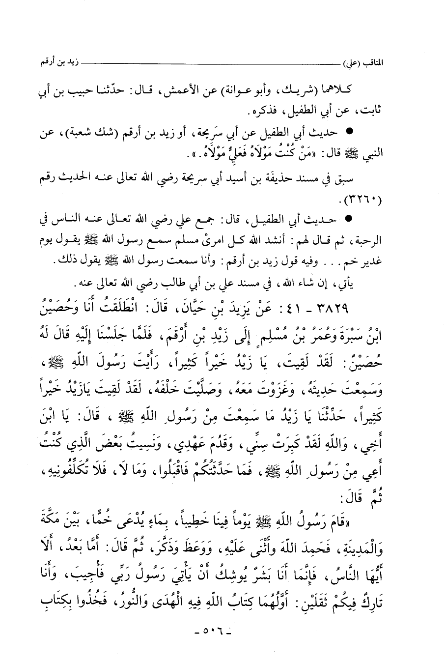 - حَدِيثُ أَبِي الطُّفَيْلِ، قَالَ: جَمَعَ عَلِيٌّ، رَضِيَ اللهُ تَعَالَى عَنْهُ، النَّاسَ فِي الرَّحْبَةِ، ثُمَّ قَالَ لَهُمْ: أَنْشُدُ اللهَ كُلَّ امْرِئٍ مُسْلمٍ، سَمِعَ رَسُولَ اللهِ صلى الله عليه وسلم، يَقُولُ يَوْمَ غَدِيرِ خُمٍّ. وَفِيهِ قَوْلُ زَيْد بْنِ أَرْقَمَ: وَأَنَا سَمِعْتُ رَسُولَ اللهِ صلى الله عليه وسلم يَقُولُ ذَلِكَ.