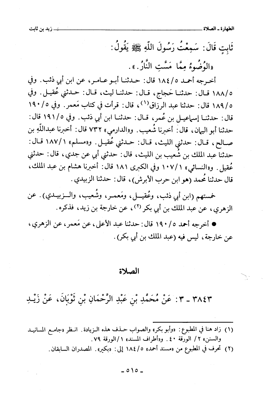- أخرجه أحمد ٥/ ١٩٠ (٢١٩٩٤) قال: حدَّثنا عَبْد الأَعْلَى، عن مَعْمَر، عن الزُّهْرِي، عن خارجة بن زَيْد، عن زَيْد بن ثابت. ليس فيه: عَبْد الملك بن أَبِي بَكْر.
