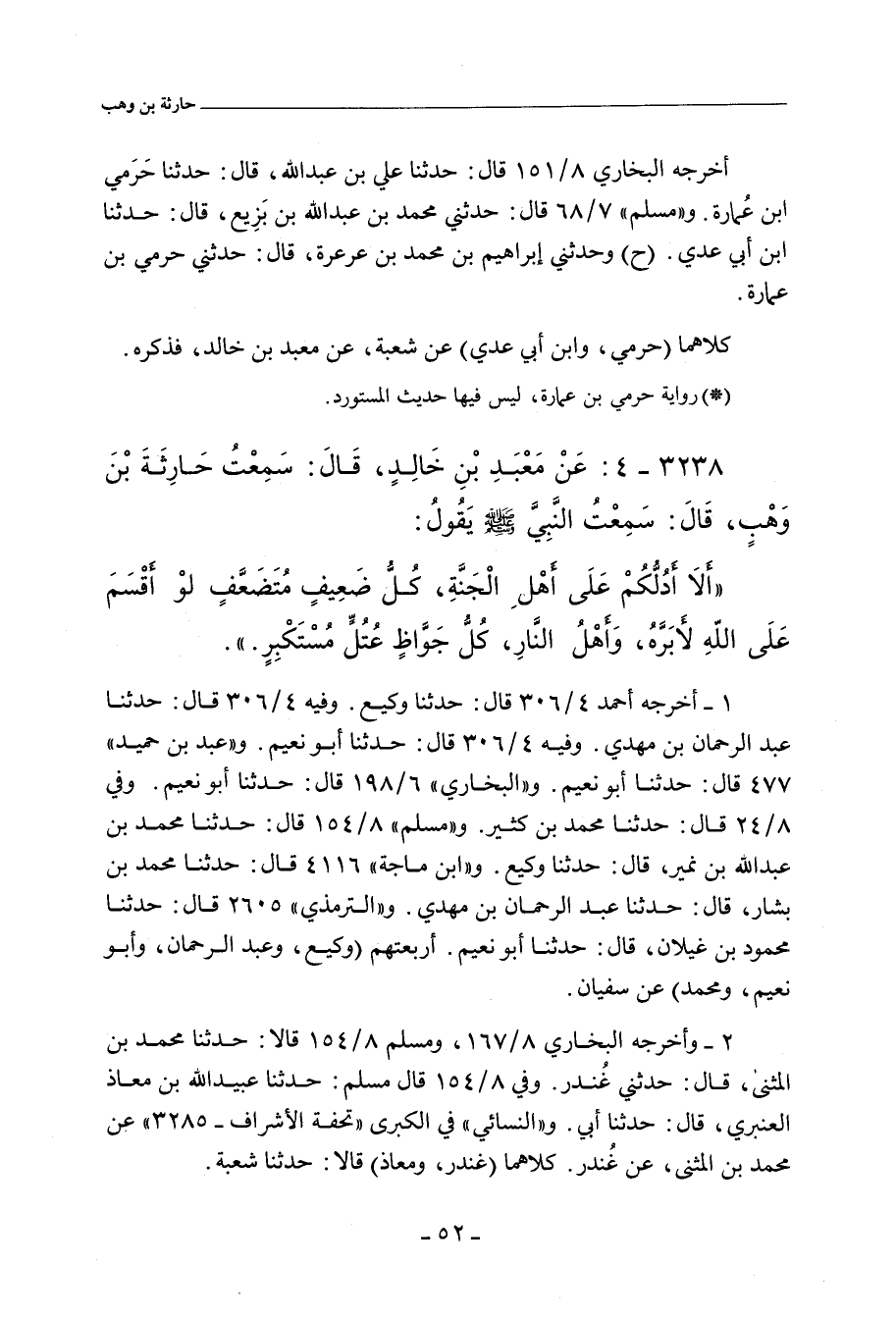 ٣٢٣٨ - عَنْ مَعْبَدِ بْنِ خَالِدٍ، قَالَ: سَمِعْتُ حَارِثَةَ بْنَ وَهْبٍ، قَالَ: سَمِعْتُ النَّبِيَّ صلى الله عليه وسلم يَقُولُ: