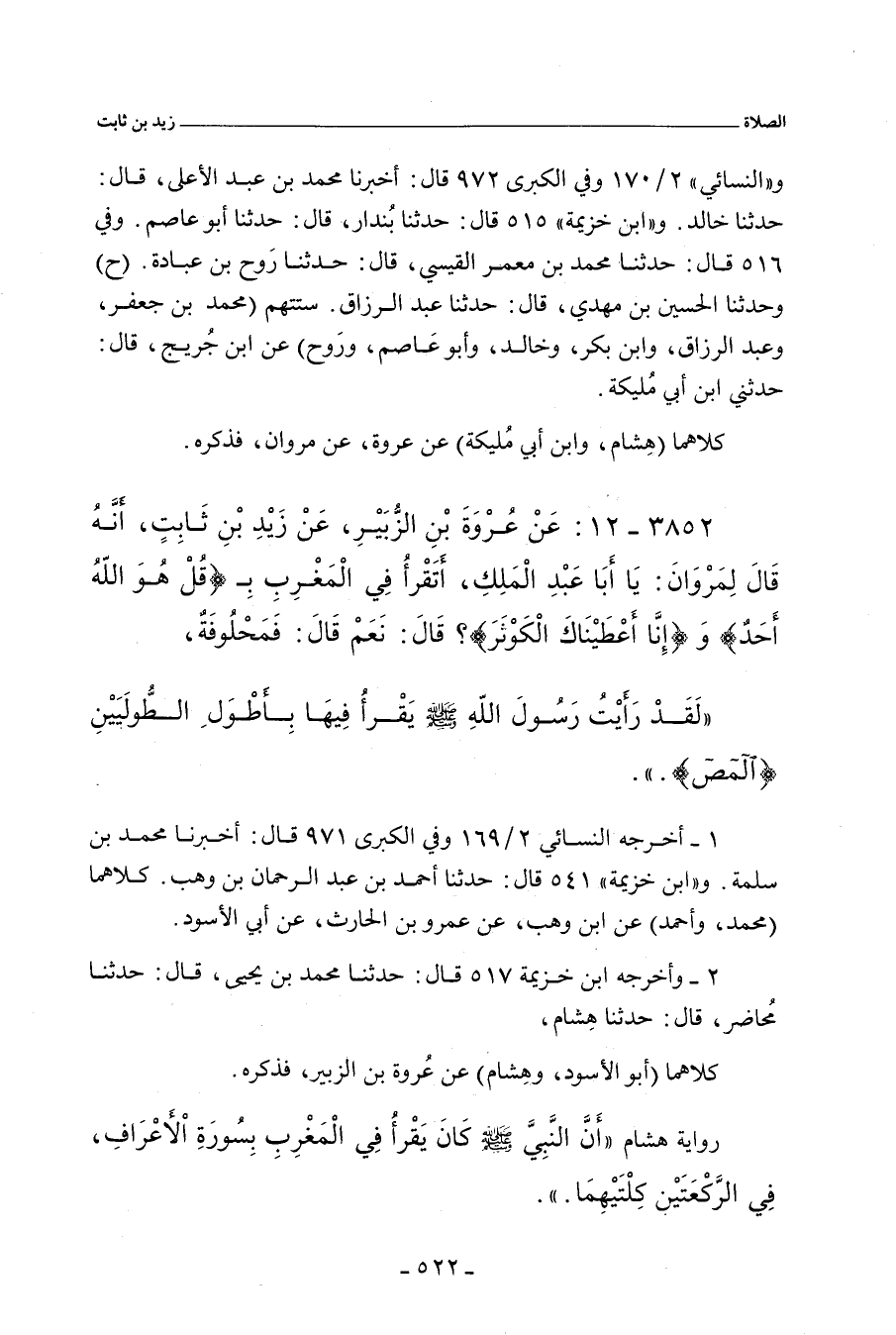 ٣٨٥٢ - عن عُرْوَة بن الزُّبَيْر، عَنْ زَيْدِ بْنِ ثَابِتٍ، أَنَّهُ قَالَ لِمَرْوَانَ: يَا أَبَا عَبْد الْمَلِكِ، أَتَقْرَأُ فِى الْمَغْرِبِ بِـ (قُلْ هُوَ اللهُ أَحَدٌ) وَ (إِنَّا أَعْطَيْنَاكَ الْكَوْثَرَ)؟ قَالَ: نَعَمْ، قَالَ: فَمَحْلُوفَةٌ؛