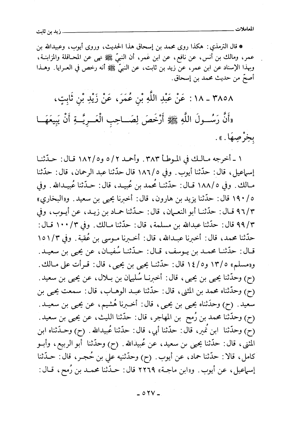 وبهذا الإسناد عن ابن عُمَر، عن زَيْد بن ثابت، عن النَّبِيِّ صلى الله عليه وسلم؛ أَنَّهُ رَخَّصَ فِي الْعَرَايَا. وهذا أصحّ من حديث مُحَمد بن إِسْحَاق.