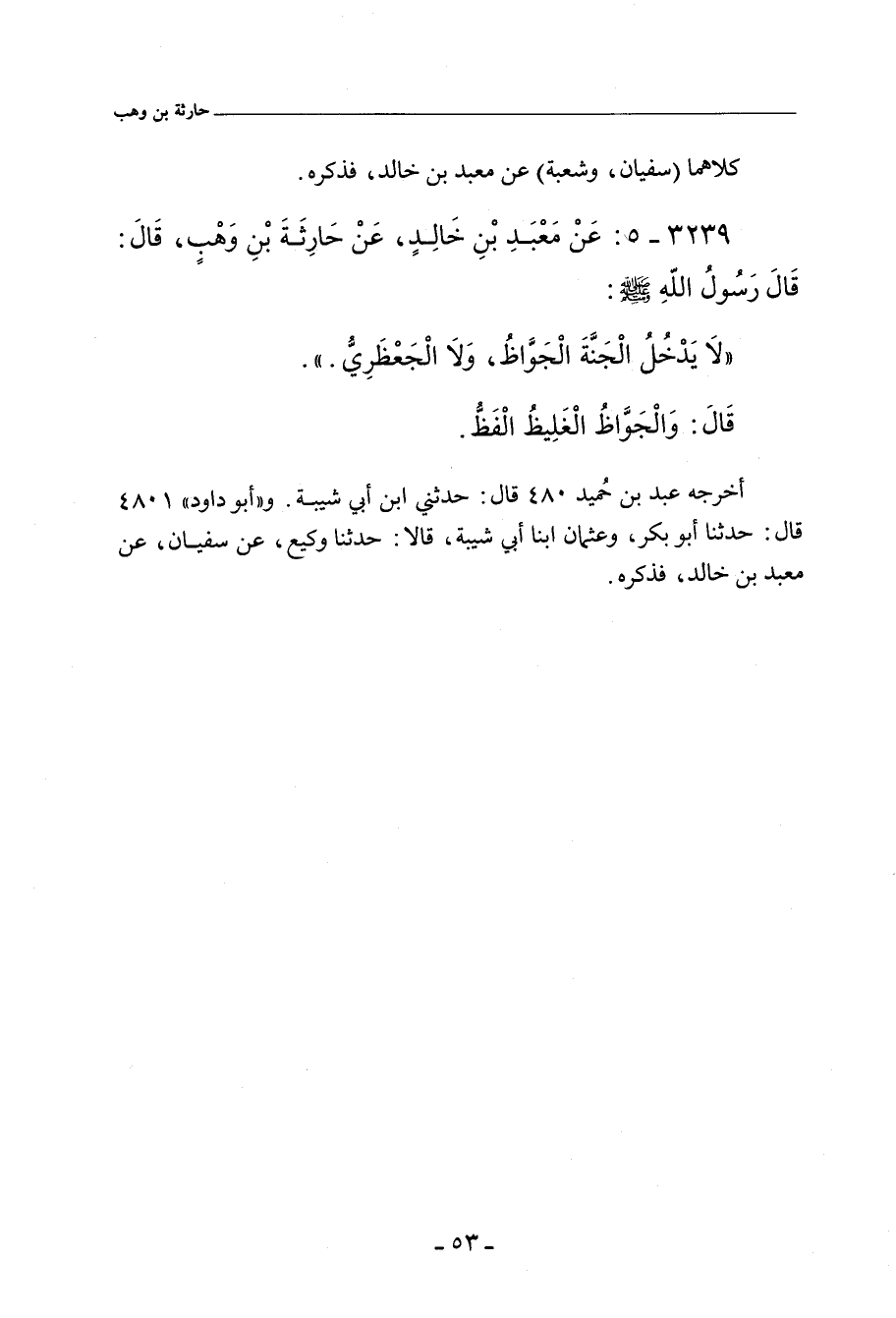 ٣٢٣٩ - عَنْ مَعْبَدِ بْنِ خَالِدٍ، عَنْ حَارِثَةَ بْنِ وَهْبٍ، قَالَ: قَالَ رَسُولُ اللهِ صلى الله عليه وسلم: