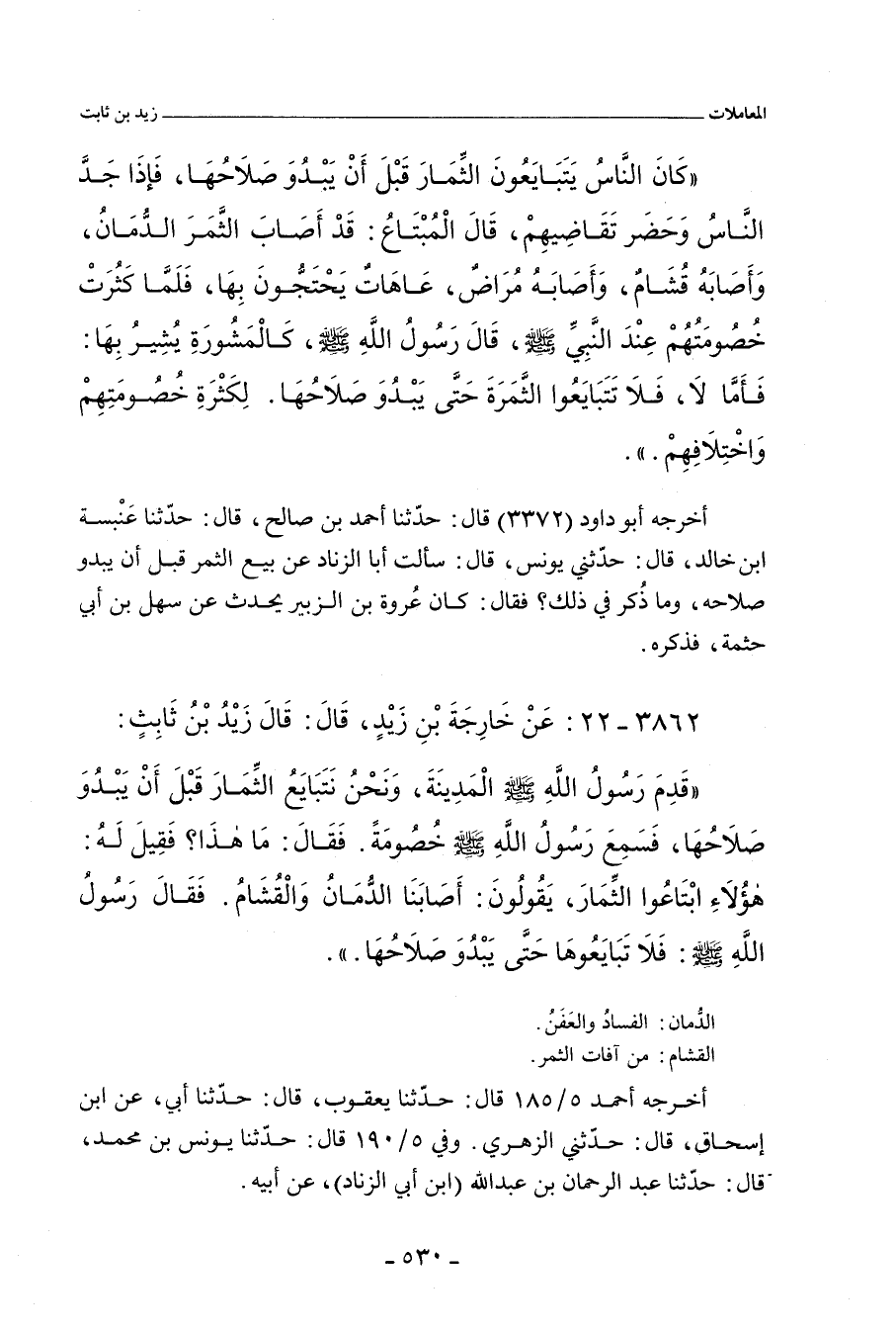 قال: وأخبرني خارجة بن زَيْد بن ثابت، أن زَيْد بن ثابت لم يكن يبيع ثمار أرضه، حتى بطلُع الثُّريا، فيتبين الأَصْفَر من الأَحْمَر.