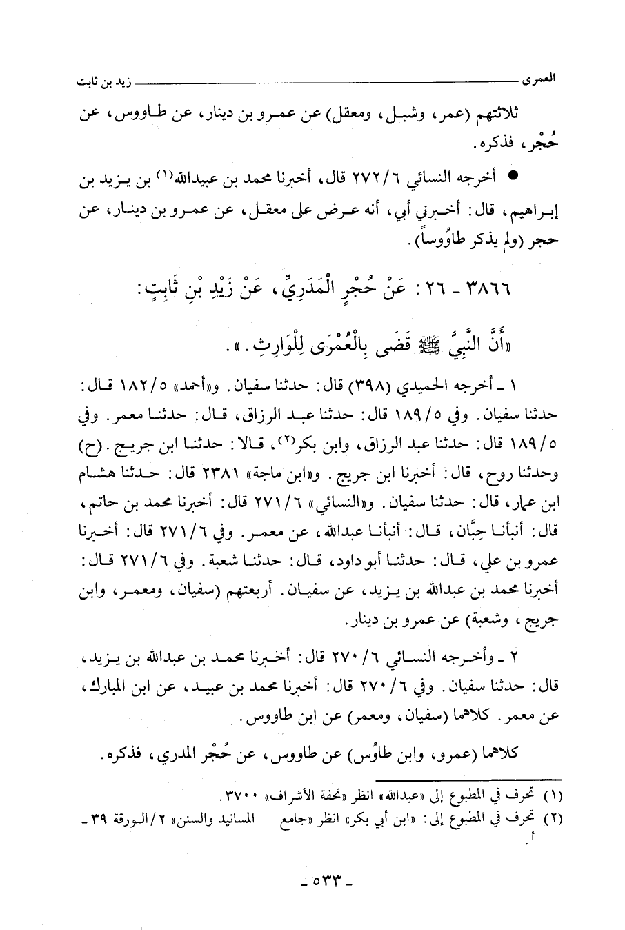 ٣٨٦٦ - عَنْ حُجْرٍ الْمَدَرِيِّ، عَنْ زَيْدِ بْنِ ثَابِتٍ؛