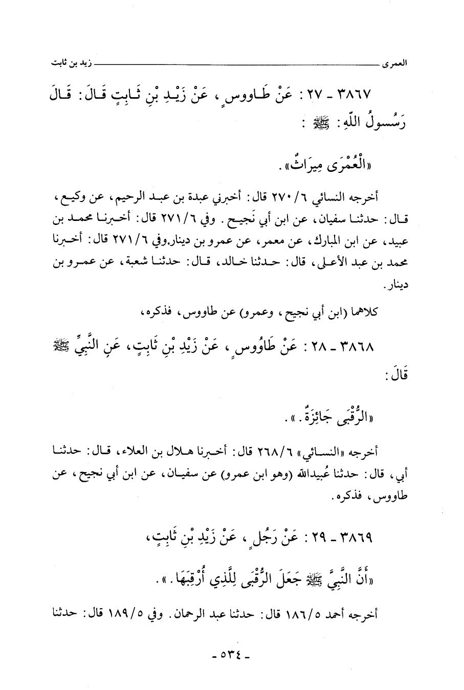 ٣٨٦٨ - عَنْ طَاوُوسٍ، عَنْ زَيْدِ بْنِ ثَابِتٍ، عَنِ النَّبِيِّ صلى الله عليه وسلم، قَالَ: