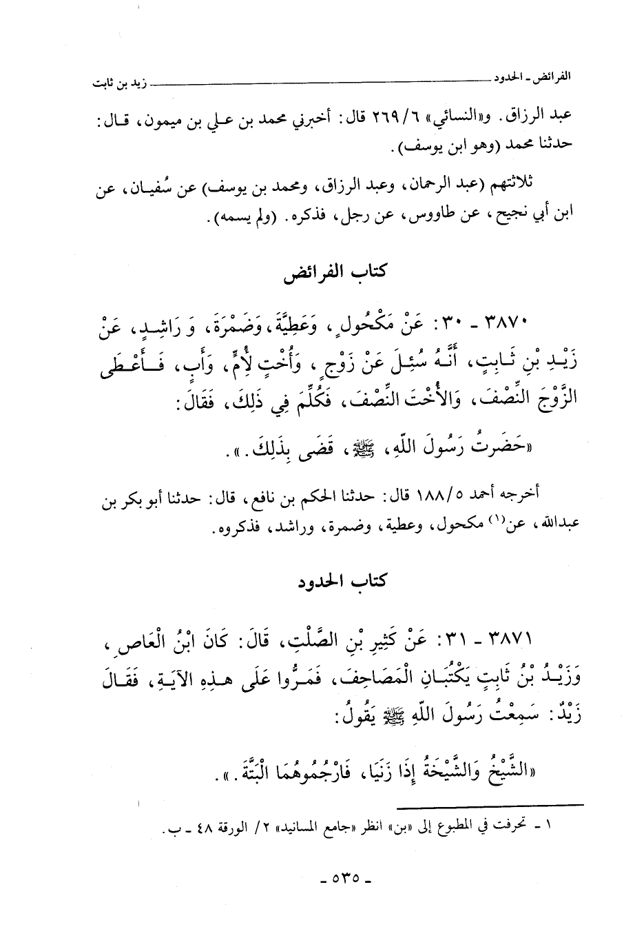 ٣٨٧٠ - عَنْ مَكْحُولٍ، وَعَطِيَّةَ، وَضَمْرَةَ، وَرَاشِدٍ، عَنْ زَيْدِ بْنِ ثَابِتٍ، أَنَّهُ سُئِلَ عَنْ زَوْجٍ، وَأُخْتٍ لأُمٍّ وَأَبٍ، فَأَعْطَى الزَّوْجَ النِّصْفَ، وَالأُخْتَ النِّصْفَ، فَكُلِّمَ فِي ذَلِكَ، فَقَالَ: