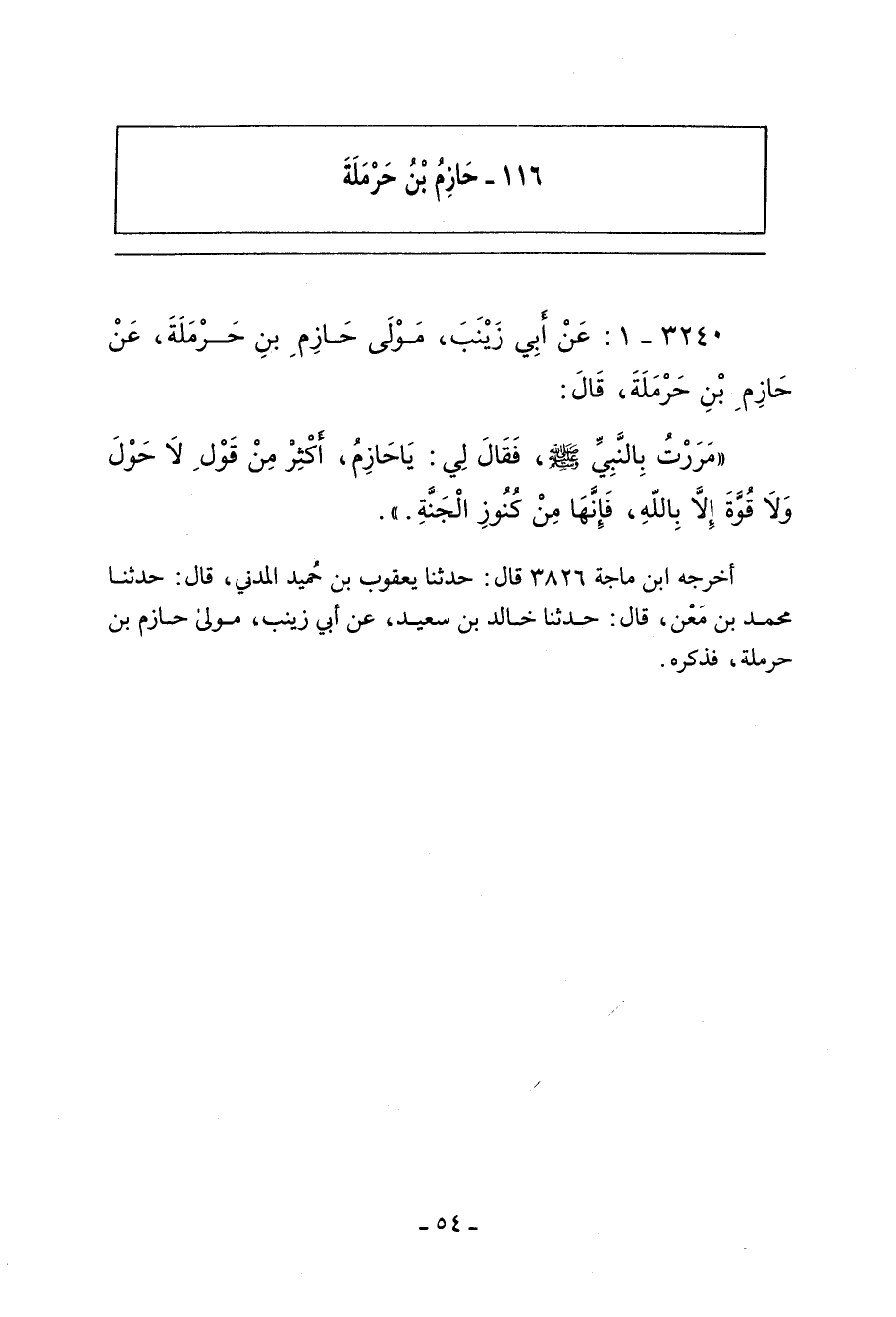 مَرَرْتُ بِالنَّبِيِّ صلى الله عليه وسلم، فَقَالَ لِي: يَا حَازِمُ، أَكْثِرْ مِنْ قَوْلِ: لَا حَوْلَ وَلَا قُوَّةَ إِلَاّ بِاللهِ، فَإِنَّهَا مِنْ كُنُوزِ الْجَنَّةِ.