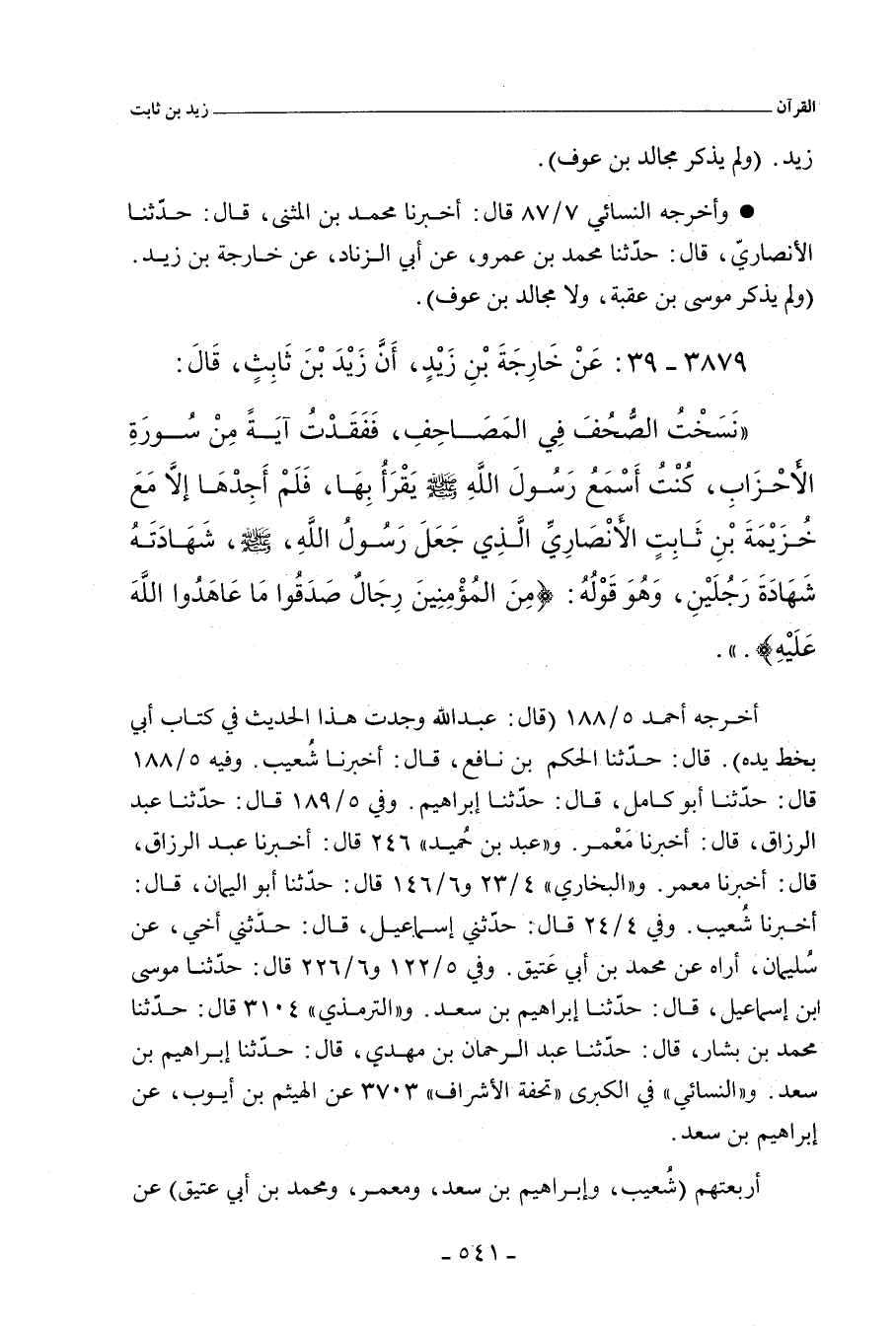 نَسَخْتُ الصُّحُفَ فِي الْمَصَاحِفِ، فَفَقَدْتُ آيَةً مِنْ سُورَةِ الأَحْزَابِ، كُنْتُ أَسْمَعُ رَسُولَ اللهِ صلى الله عليه وسلم يَقْرَأُ بِهَا، فَلَمْ أَجِدْهَا إِلَاّ مَعَ خُزَيْمَةَ بْنِ ثَابِتٍ الأَنْصَارِيِّ، الَّذِي جَعَلَ رَسُولُ اللهِ صلى الله عليه وسلم شَهَادَتَهُ شَهَادَةَ رَجُلَيْنِ، وَهُْوَ قَوْلُهُ: (مِنَ الْمُؤْمِنِينَ رِجَالٌ صَدَقُوا مَا عَاهَدُوا اللهَ عَلَيْهِ).