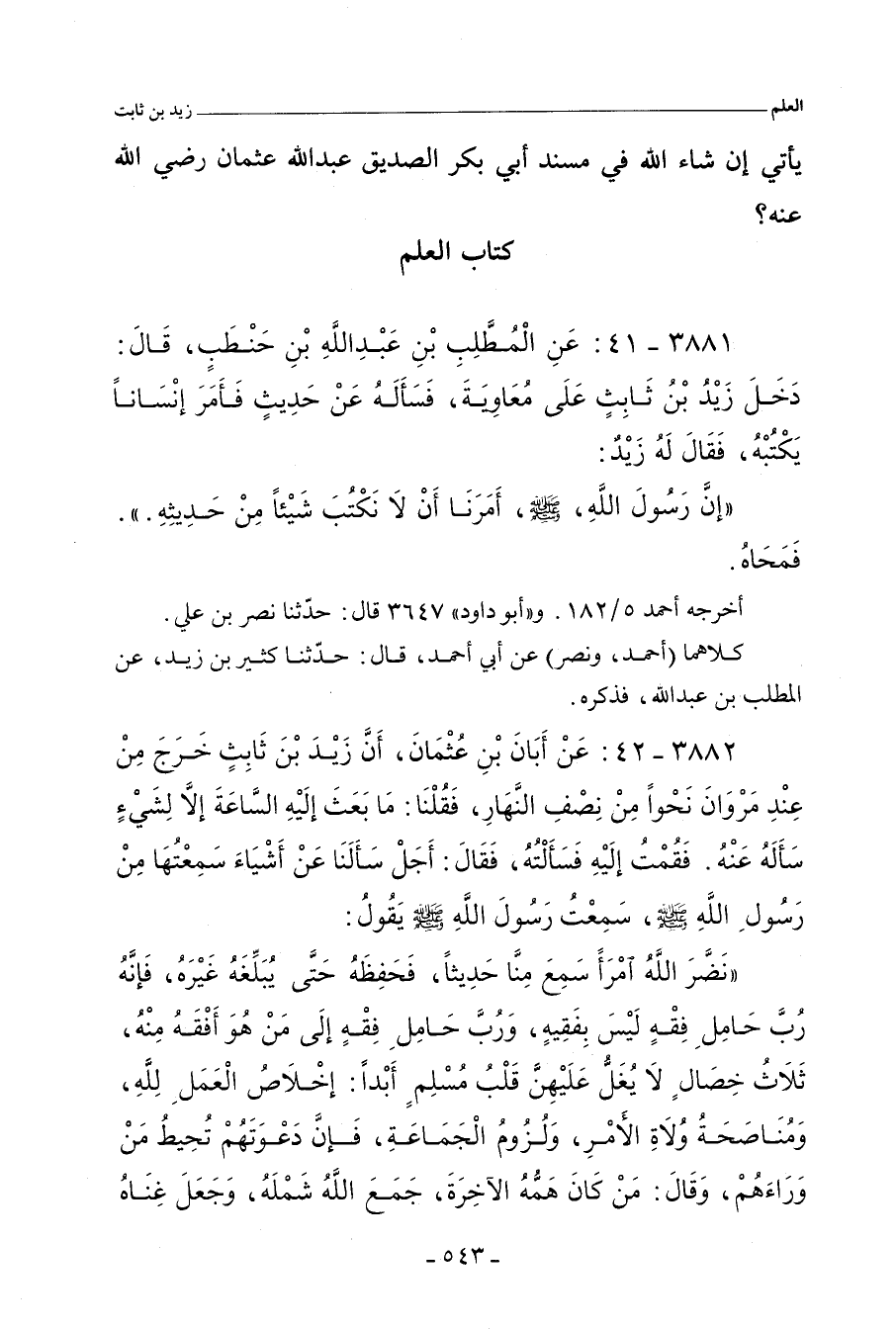 ٣٨٨١ - عَنِ الْمُطَّلِبِ بْنِ عَبْدِ اللهِ بْنِ حَنْطَبٍ، قَالَ: دَخَلَ زَيْدُ بْنُ ثَابِتٍ عَلَى مُعَاوِيَةَ، فَسَأَلَهُ عَنْ حَدِيثٍ، فَأَمَرَ إِنْسَانًا يَكْتُبُهُ، فَقَالَ لَهُ زَيْدٌ: