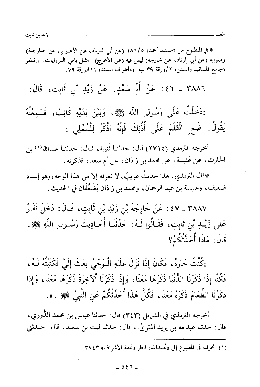 ٣٨٨٦ - عَنْ أُمِّ سَعْدٍ، عَنْ زَيْدِ بْنِ ثَابِتٍ، قَالَ: