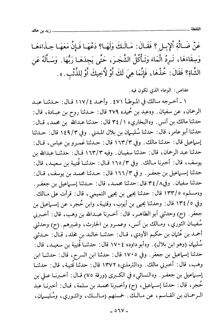 عَنْ ضَالَّةِ الإِبِلِ؟ فَقَالَ: مَالَكَ وَلَهَا؟ دَعْهَا فَإِنَّ مَعَهَا حِذَاءَهَا، وَسِقَاءَهَا، تَرِدُ الْمَاءَ، وَتَأْكُلُ الشَّجَرَ، حَتَّى يَجِدَهَا رَبُّهَا، وَسَأَلَهُ عَنِ الشَّاةِ؟ فَقَالَ: خُذْهَا، فَإِنَّمَا هِيَ لَكَ، أَوْ لأَخِيكَ، أَوْ لِلذِّئْبِ.