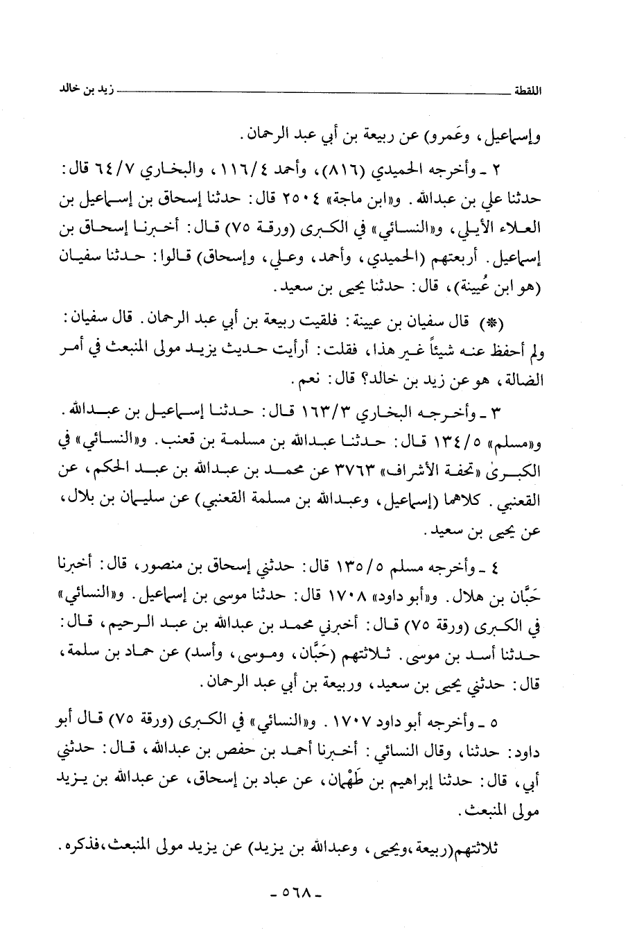 - أخرجه ابن ماجة (٢٥٠٤. والنَّسَائِي، في "الكبرى" ٥٧٣٨ و ٥٧٧١ و ٥٧٨٣ كلاهما عن إِسْحَاق بن إِسْمَاعِيل بن العَلَاء الأَيْلِي، حدَّثنا سُفْيان بن عُيَيْنَة، عن يَحيى بن سَعِيد، عن رَبِيعَة بن أَبِي عَبْد الرَّحْمان، عن يَزِيد مَوْلَى المُنْبَعِث، عن زَيْد بن خالد الجُهَنِي.