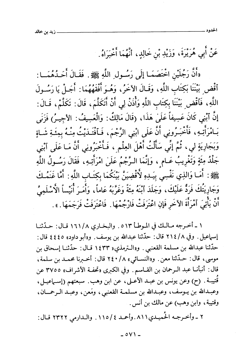 أَنَّ رَجُلَيْنِ اخْتَصَمَا إِلَى رَسُولِ اللهِ صلى الله عليه وسلم، فَقَالَ أَحَدُهُمَا: اقْضِ بَيْنَنَا بِكِتَابِ اللهِ، وَقَالَ الآخَرُ، وَهُْوَ أَفْقَهُهُمَا: أَجَلْ يَا رَسُولَ اللهِ، فَاقْضِ بَيْنَنَا بِكِتَابِ اللهِ، وَأْذَنْ لِي أَنْ أَتَكَلَّمَ، قَالَ: تَكَلَّمْ، قَالَ: إِنَّ ابْنِي كَانَ عَسِيفًا عَلَىَ هَذَا - قَالَ مَالِكٌ: وَالْعَسِيفُ: الأَجِيرُ - فَزَنَى بِامْرَأَتِهِ، فَأَخْبَرُونِي أَنَّ عَلَى ابْنِي الرَّجْمَ، فَافْتَدَيْتُ مِنْهُ بِمِئَةِ شَاةٍ، وَبِجَارِيَةٍ لِي، ثُمَّ إِنِّي سَأَلْتُ أَهْلَ الْعِلْمِ، فَأَخْبَرُونِي أَنَّ مَا عَلَى ابْنِي جَلْدُ مِئَةٍ، وَتَغْرِيبُ عَامٍ، وَإِنَّمَا الرَّجْمُ عَلَى امْرَأَتِهِ، فَقَالَ رَسُولُ اللهِ صلى الله عليه وسلم: أَمَا وَالَّذِي نَفْسِي بِيَدِهِ، لأَقْضِيَنَّ بَيْنَكُمَا بِكِتَابِ اللهِ، أَمَّا غَنَمُكَ وَجَارِيَتُكَ، فَرَدٌّ عَلَيْكَ، وَجَلَدَ ابْنَهُ مِئَةً، وَغَرَّبَهُ عَامًا، وَأَمَرَ أُنَيْسًا الأَسْلَمِي أَنْ يَأْتِيَ امْرَأَةَ الآخَرِ، فَإِنِ اعْتَرَفَتْ، فَارْجُمْهَا، فَاعْتَرَفَتْ، فَرَجَمَهَا.