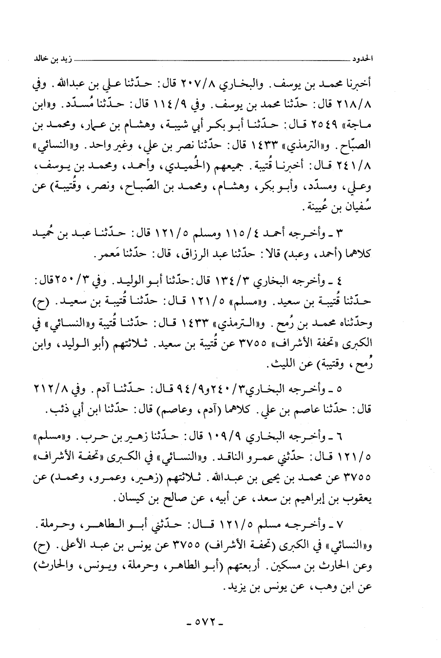 وفي ٨/ ٢٠٧ (٦٨٢٧ و ٦٨٢٨) قال: حدَّثنا علي بن عَبْد اللهِ، حدَّثنا سُفْيان. وفي ٨/ ٢١٢ (٦٨٣٥ و ٦٨٣٦) قال: حدَّثنا عاصم بن علي، حدَّثنا ابن أَبِي ذِئْب. وفي ٨/ ٢١٤ (٦٨٤٢ و ٦٨٤٣) قال: حدَّثنا عَبْد اللهِ بن يُوسُف، أخبرنا مالك. وفي ٨/ ٢١٨ (٦٨٥٩ و ٦٨٦٠) قال: حدَّثنا مُحَمد بن يُوسُف، حدَّثنا ابن عُيَيْنَة. وفي ٩/ ١٠٩ (٧٢٥٨ و ٧٢٥٩) قال: حدَّثنا زُهَيْر بن حَرْب، حدَّثنا يَعْقُوب بن إبراهيم، حدَّثنا أَبِي، عن صالح. وفي ٩/ ١١٤ (٧٢٧٨ و ٧٢٧٩) قال: حدَّثنا مُسَدَّد، حدَّثنا سُفْيان. و"مسلم" ٥/ ١٢١ (٤٤٥٤) قال: حدَّثنا قُتَيْبَة بن سَعِيد، حدَّثنا لَيْث (ح) وحدَّثناه مُحَمد بن رُمْح، أخبرنا اللَّيْث. وفي ٥/ ١٢١ (٤٤٥٥) قال: حدَّثني أبو الطَّاهر , وحَرْمَلَة، قالا: أخبرنا ابن وَهْب، أخبرني يُونُس (ح) وحدَّثني عَمْرو النَّاقِد، حدَّثنا يَعْقُوب بن إبراهيم بن سَعْد، حدَّثنا أَبِي، عن صالح (ح) وحدَّثنا عَبْد بن حُمَيْد، أخبرنا عَبْد الرَّزَّاق، عن مَعْمَر. و"أبو داود" ٤٤٤٥ قال: حدَّثنا عَبْد اللهِ بن مَسْلَمَة القَعْنَبِي، عن مالك. والتِّرْمِذِيّ" ١٤٣٣ قال: حدَّثنا إِسْحَاق بن مُوسَى الأَنْصَارِي، حدَّثنا مَعْن، حدَّثنا مالك (ح) وحدَّثنا قُتَيْبَة، حدَّثنا اللَّيْث. و"النَّسائي" ٨/ ٢٤٠ قال: أخبرنا مُحَمد بن سَلَمَة، قال: أنبأنا عَبْد الرَّحْمان بن القاسم، عن مالك. وفي "الكبرى"