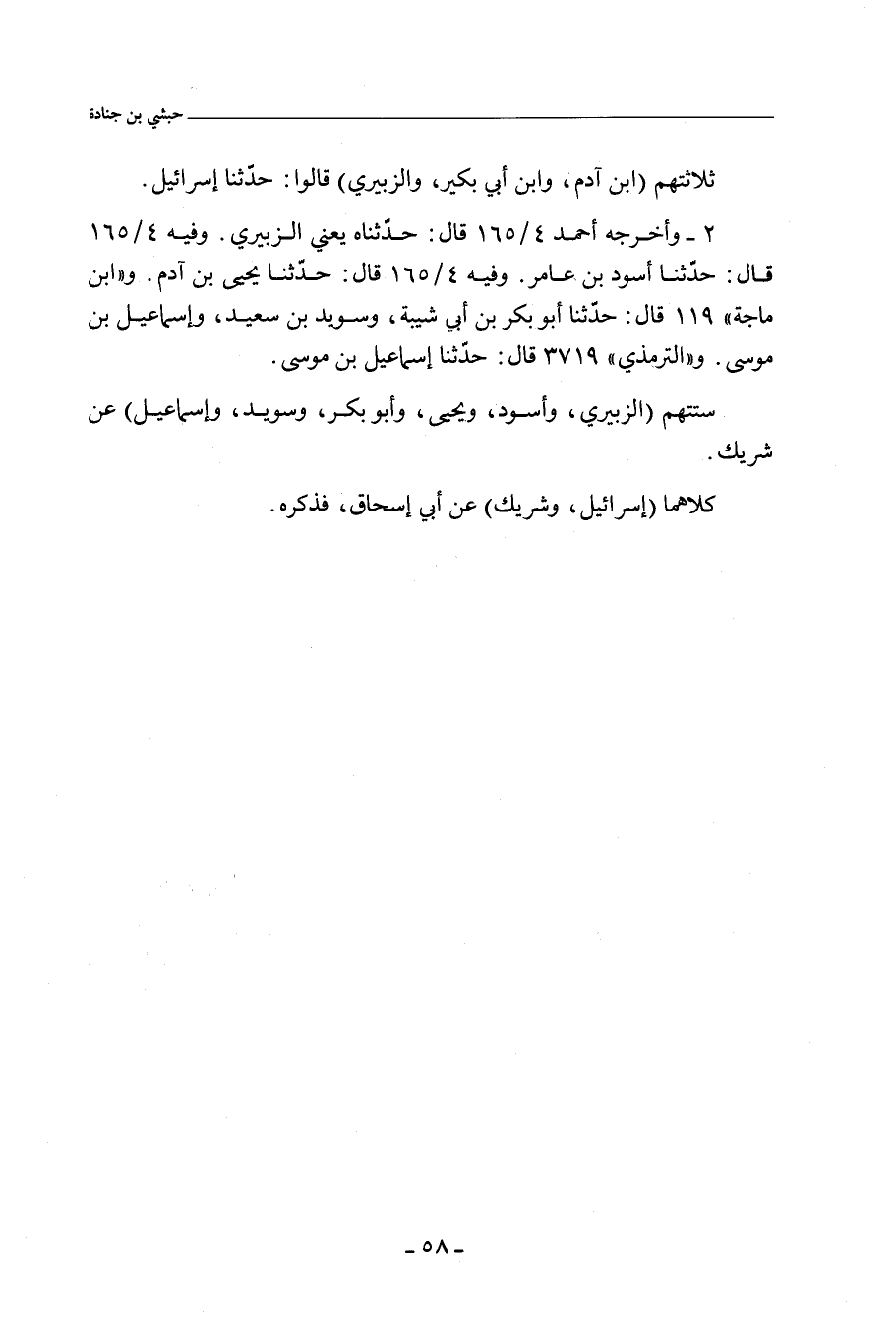 - وفي رواية أَبي أحمد الزُّبَيْرِي، عن شَرِيك، قال: فقلتُ لأَبي إِسْحَاق: أَنَّى سَمِعْتَ منه؟ قال: وقف علينا، على فرسٍ له، في مجلسنا، في جبانة السَّبِيع.