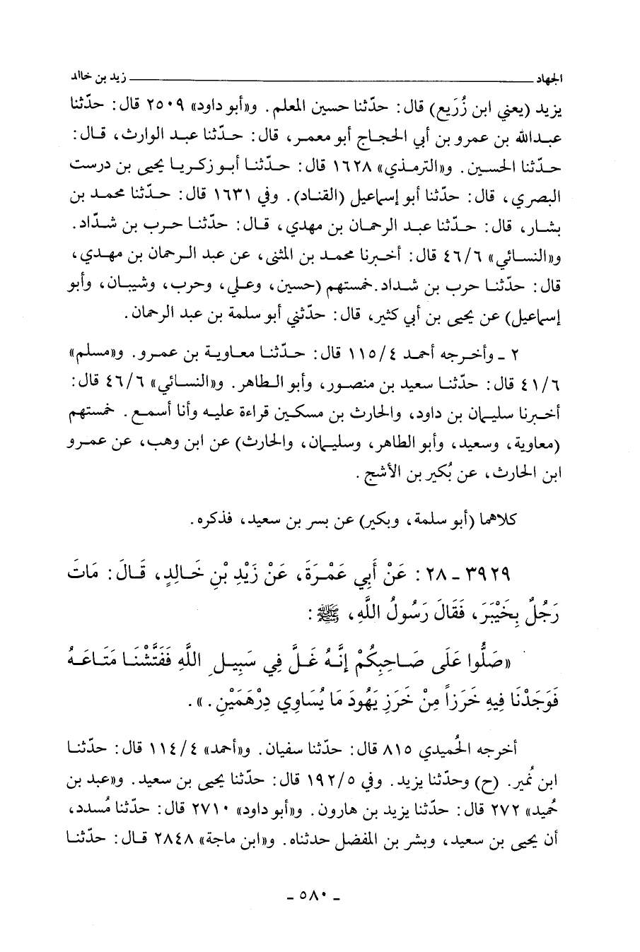 ٣٩٢٩ - عَنْ أَبِي عَمْرَةَ، عَنْ زَيْدِ بْنِ خَالِدٍ، قَالَ: مَاتَ رَجُلٌ بِخَيْبَرَ، فَقَالَ رَسُولُ اللهِ صلى الله عليه وسلم: