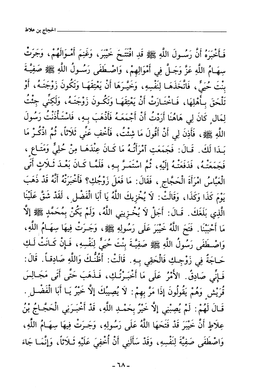 فَأَخْبَرَهُ أَنَّ رَسُولَ اللهِ صلى الله عليه وسلم قَدِ افْتَتَحَ خَيْبَرَ، وَغَنِمَ أَمْوَالَهُمْ، وَجَرَتْ سِهَامُ اللهِ، عَزَّ وَجَلَّ، فِي أَمْوَالِهِمْ، وَاصْطَفَى رَسُولُ اللهِ صلى الله عليه وسلم صَفِيَّةَ بِنْتَ حُيَيٍّ، فَاتَّخَذَهَا لِنَفْسِهِ، وَخَيَّرَهَا أَنْ يُعْتِقَهَا وَتَكُونَ زَوْجَتَهُ، أَوْ تَلْحَقَ بِأَهْلِهَا، فَاخْتَارَتْ أَنْ يُعْتِقَهَا وَتَكُونَ زَوْجَتَهُ، وَلَكِنِّي جِئْتُ لِمَالٍ كَانَ لِي هَا هُنَا، أَرَدْتُ أَنْ أَجْمَعَهُ فَأَذْهَبَ بِهِ، فَاسْتَأْذَنْتُ رَسُولَ اللهِ صلى الله عليه وسلم، فَأَذِنَ لِي أَنْ أَقُولَ مَا شِئْتُ، فَأَخْفِ عَنِّي ثَلَاثًا، ثُمَّ اذْكُرْ مَا بَدَا لَكَ. قَالَ: فَجَمَعْتِ امْرَأَتُهُ مَا كَانَ عِنْدَهَا مِنْ حُلِيٍّ وَمَتَاعٍ، فَجَمَعَتْهُ، فَدَفَعَتْهُ إِلَيْهِ، ثُمَّ اسْتَمَرَّ بِهِ، فَلَمَّا كَانَ بَعْدَ ثَلَاثٍ أَتَى الْعَبَّاسُ امْرَأَةَ الْحَجَّاجِ، فَقَالَ: مَا فَعَلَ زَوْجُكِ؟ فَأَخْبَرَتْهُ أَنَّهُ قَدْ ذَهَبَ يَوْمَ كَذَا وَكَذَا، وَقَالَتْ: لَا يُخْزِيكَ اللَّهُ يَا أَبَا الْفَضْلِ، لَقَدْ شَقَّ عَلَيْنَا