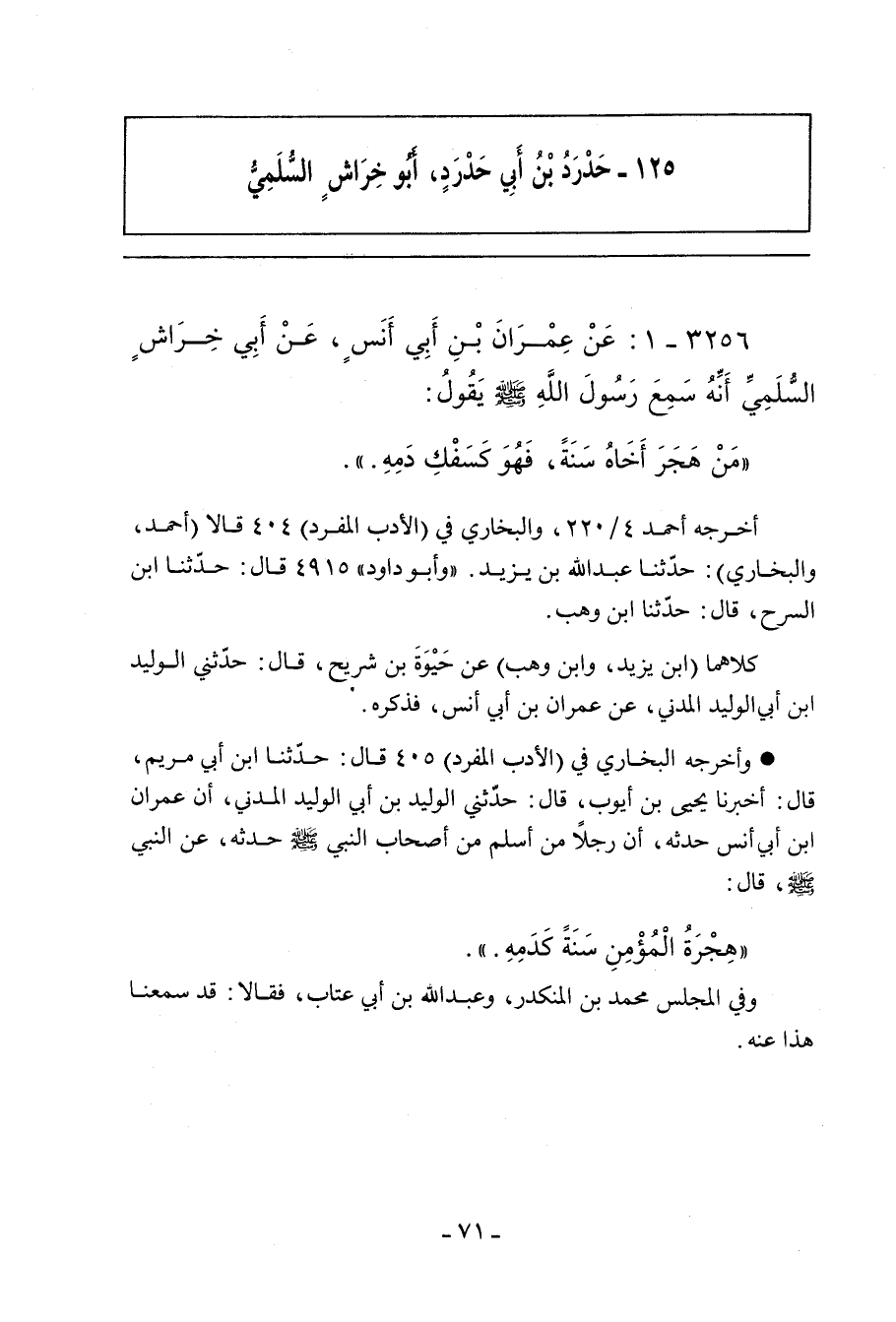 ٣٢٥٦ - عَنْ عِمْرَانَ بْنِ أَبِي أَنَسٍ، عَنْ أَبِي خِرَاشٍ السُّلَمِيِّ، أَنَّهُ سَمِعَ رَسُولَ اللهِ صلى الله عليه وسلم يَقُولُ: